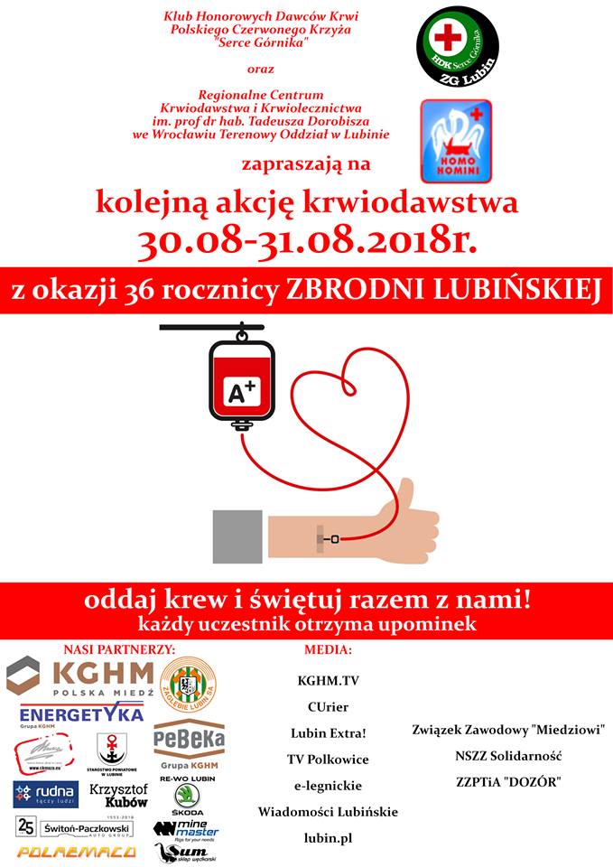 O poległych pamiętają również dawcy krwi. Klub Honorowych Dawców Krwi „Serce Górnika” działający przy ZG Lubin, zaprasza do uczczenia pamięci Ofiar Zbrodni Lubińskiej.