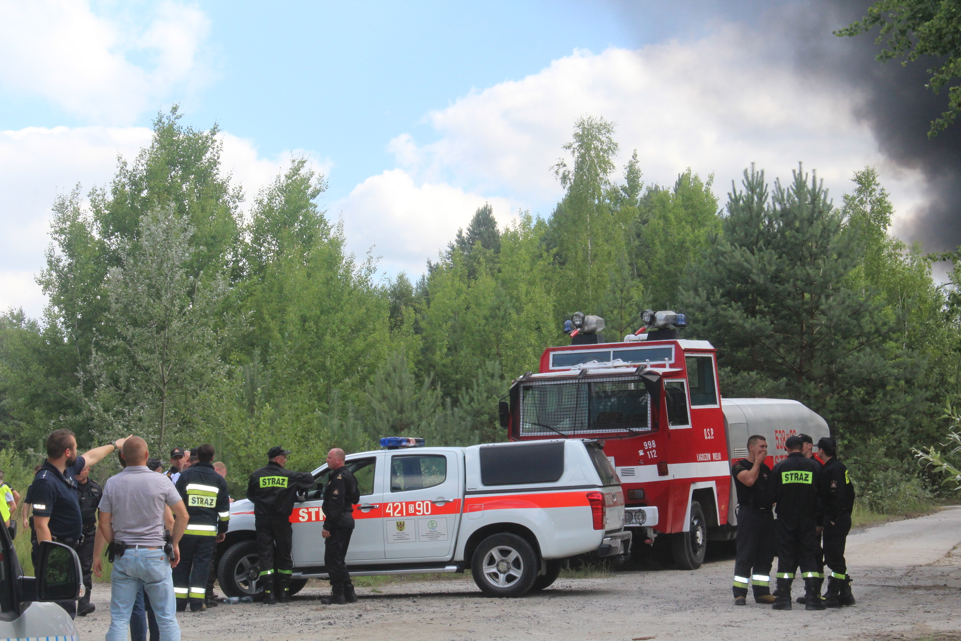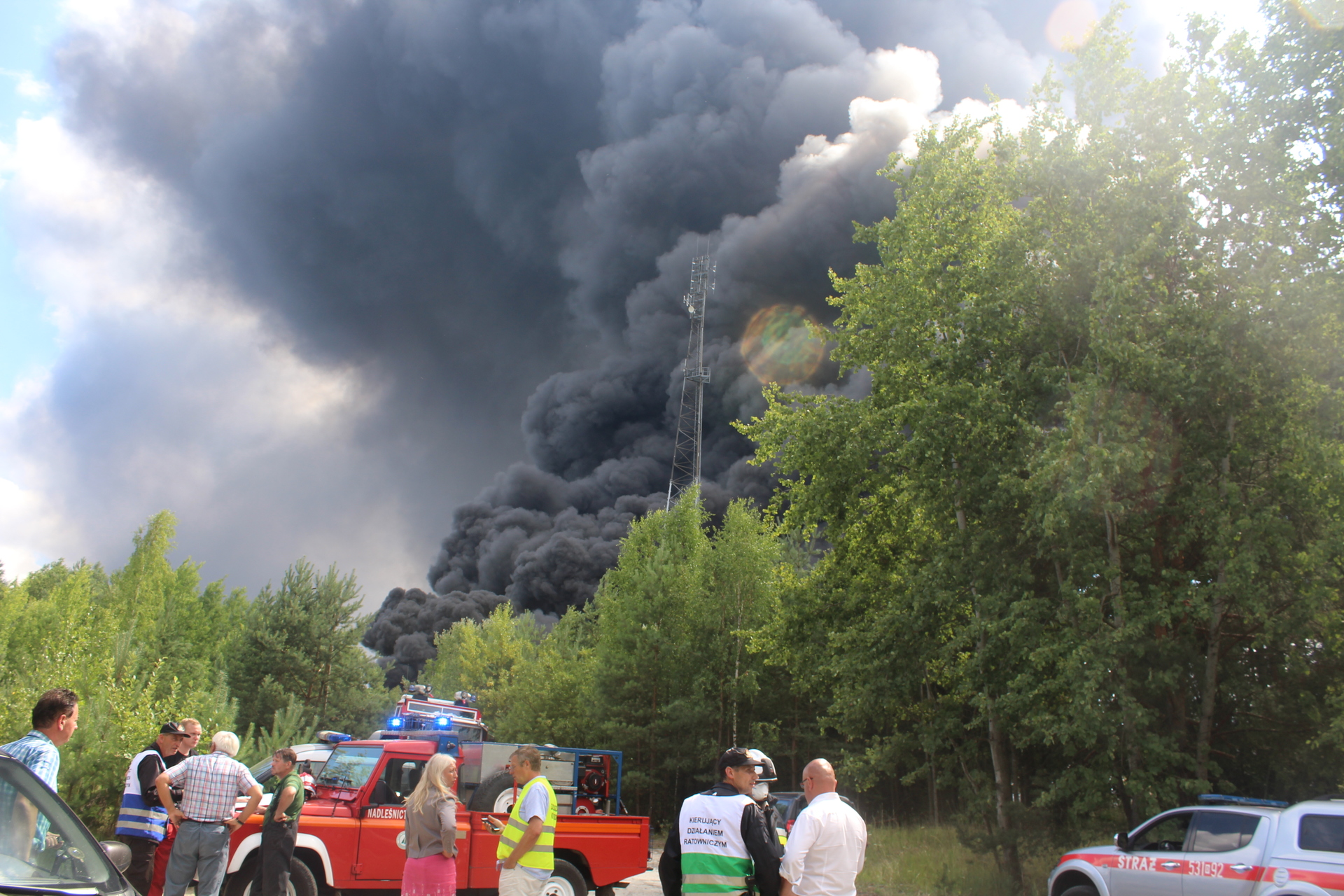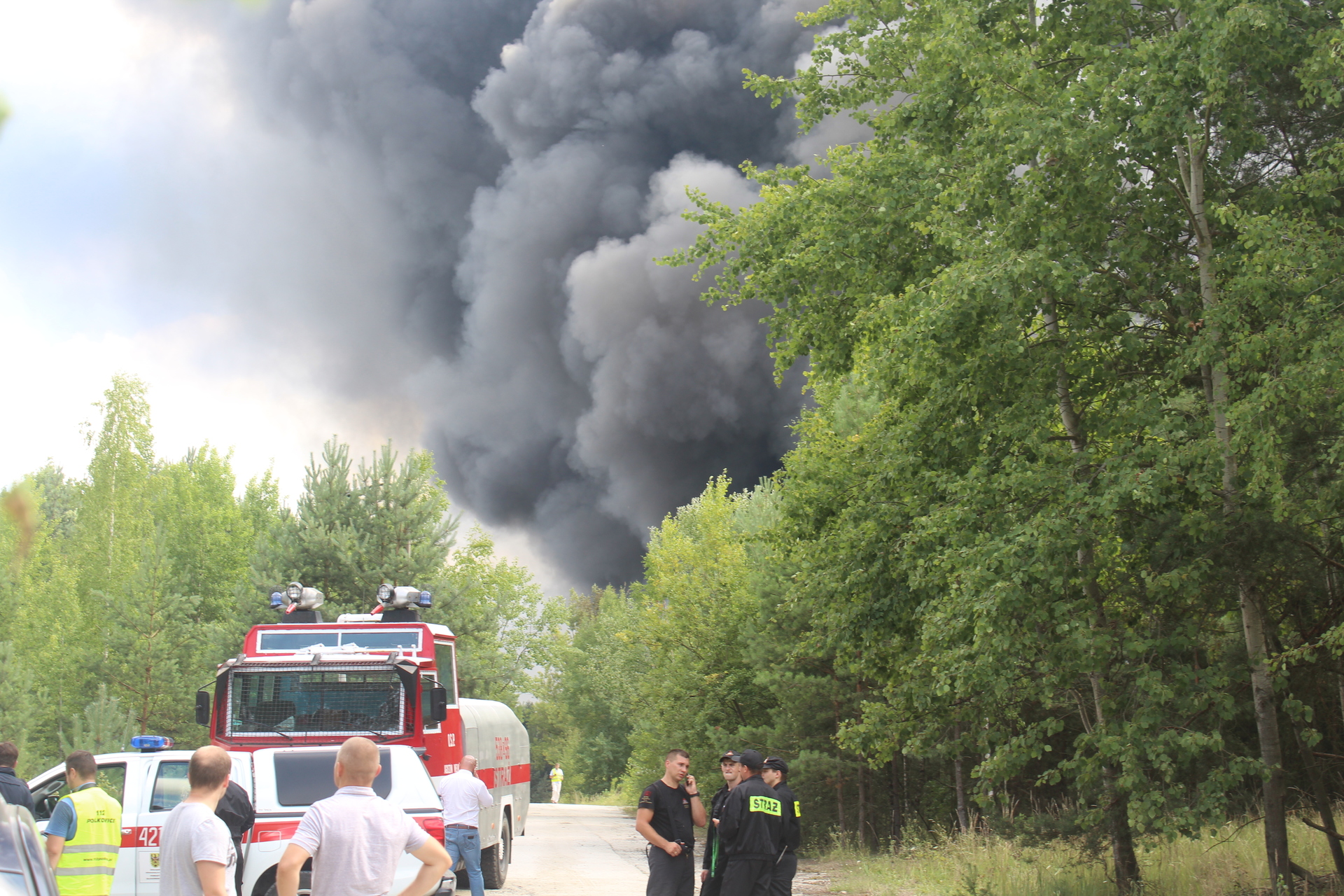 W akcji gaśniczej bierze udział ponad 30 jednostek straży pożarnej z całego rejonu, także z województwa lubuskiego, w tym samoloty gaśnicze. Na miejscu jest też karetka pogotowia. Często słychać wybuchy. Wokół są lasy, więc strażacy starają się też, by ogień się nie rozprzestrzeniał.