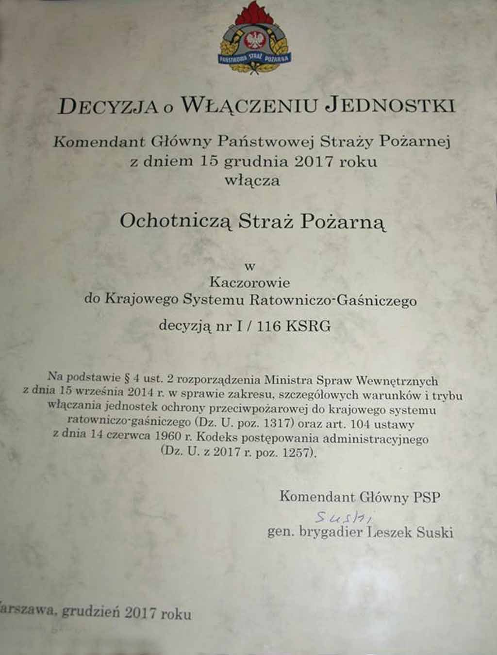 Decyzję potwierdzającą nowy statu jednostki wręczył kaczorowskim ratownikom zastępca komendanta wojewódzkiego Państwowej Straży Pożarnej Marek Kamiński. W wydarzeniu wziął udział zastępca komendanta miejskiego PSP w Jeleniej Górze Andrzej Ciosek, wiceprezes dolnośląskiego oddziału Związku Ochotniczych Straży Pożarnych RP Grzegorz Obara, komendant powiatowy PSP w Jaworze Waldemar Sarlej, komendant policji w Bolkowie Arkadiusz Loranty i przedstawiciele bolkowskiego samorządu.