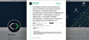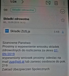 – Zgłaszają się do naszych placówek klienci, którzy otrzymują fałszywe informacje, stąd nasz apel, aby ich nie otwierać – mówi Iwona Kowalska-Matis, Regionalny Rzecznik Prasowy ZUS na Dolnym Śląsku. – Ostrzeżenie wydał już CERT Polska informując, że kliknięcie w link powoduje natychmiastowe zainfekowanie komputera – dodaje rzeczniczka.