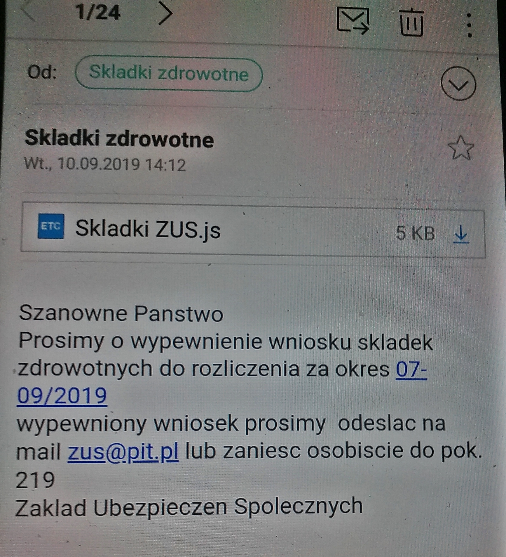 W ostatnich dniach do części klientów ZUS trafiają informacje wysyłane na telefony oraz w postaci maili, z żądaniem wypełnienia wniosku do rozliczenia składek zdrowotnych za wrzesień. Jak ostrzega CERT, przesyłka zawiera złośliwe treści powodujące zainfekowanie komputera, blokadę dostępu do plików, czy przechwycenie wrażliwych danych, np. loginów i haseł bankowości elektronicznej, czy mediów społecznościowych. Jeśli otrzymamy taki mail, najlepiej od razu go skasować.