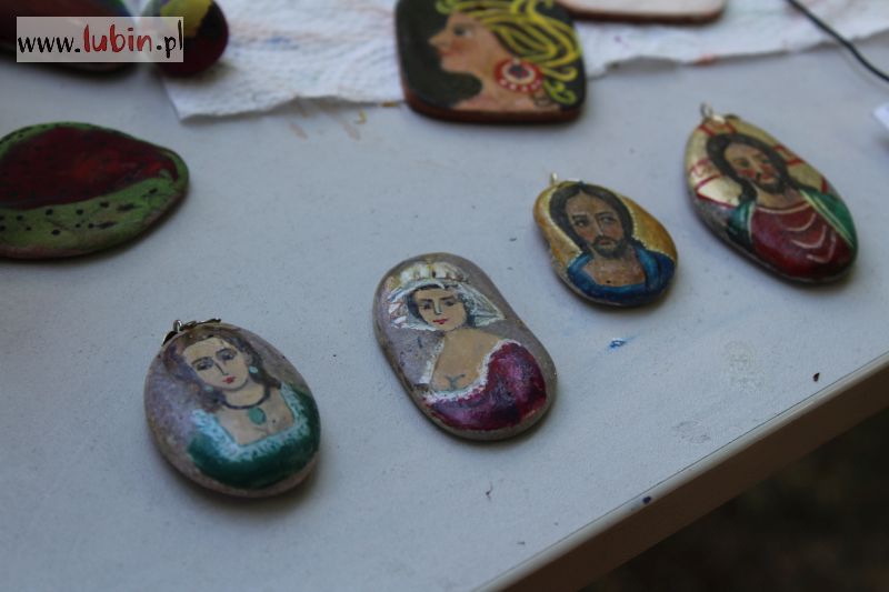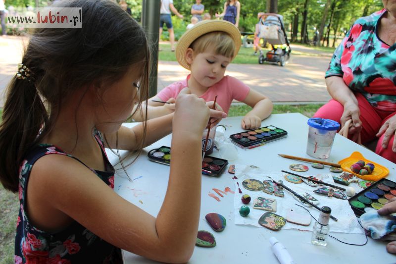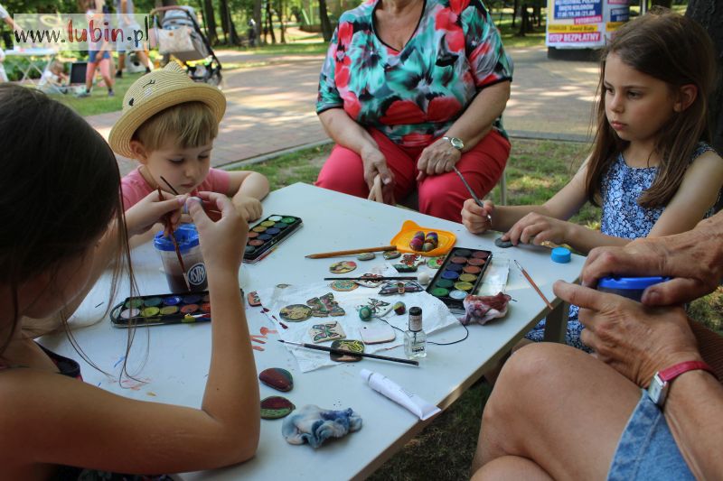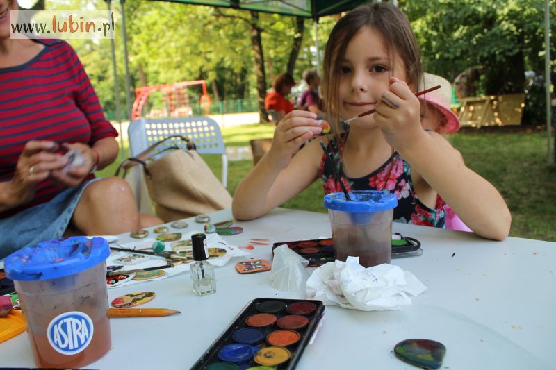 Dla małych lubinian przygotowała dziś stoisko, gdzie mogły pomalować kamyki plakatówkami lub akwarelami. W domu maluje farbami ceramicznymi. Czasem w ten sposób stworzy wisiorek, innym razem mały obraz. – A ja na swoim namalowałam dziś tęczę – podnosi swój kamyk 5-letnia Ola.