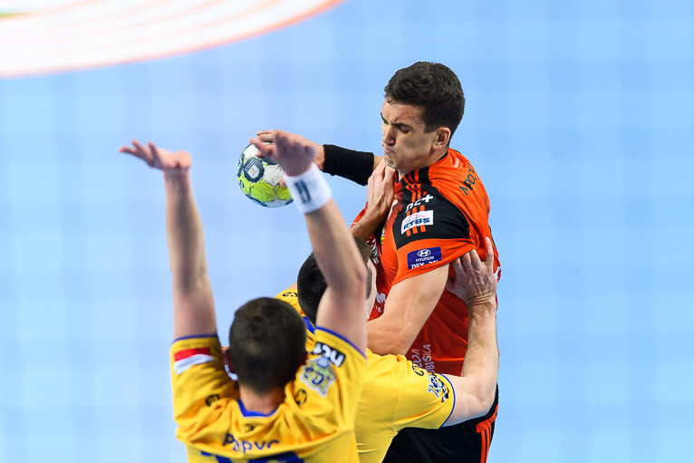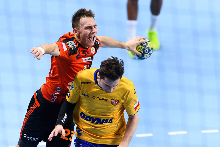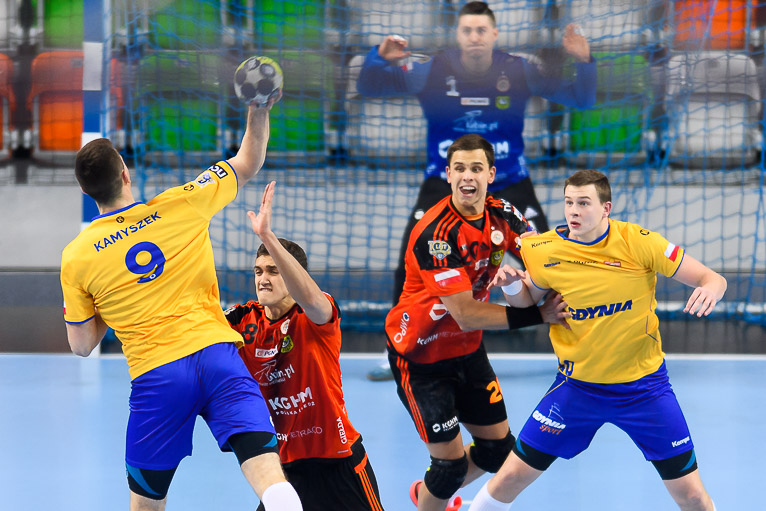 Lubinianie od początku byli bardzo skupieni, mając w pamięci dwa ostatnie mecze. Po pięciu minutach gry było 3:1 dla Zagłębie. W ósmej minucie mieliśmy 7:3, a połowę bramek (po 3) zdobyli Przemysław Mrozowicz i Arkadiusz Moryto. Po stronie przyjezdnych tyle trafień miał też Rafał Jamioł, ale jego drużyna musiała odrabiać straty. Ambicji gościom odmówić nie można, jednak to gospodarze nadawali ton grze i powiększali swoją przewagę, która wynosiła już bramek – 10:5. Ozdobą meczu była wrzutka Dawida Przysieka do Arkadiusza Moryto w 16. minucie spotkania. Gdynianie nie zamierzali składać broni i w krótkim czasie wynik minus pięć zniwelowali do dwóch trafień. Na szczęście dla miedziowych ich przestój nie trwał zbyt długo, kolejne piłki odbijał Patryk Małecki i jeszcze przed przerwą lubinianie nie dość, że odzyskali przewagę z początku meczu, to jeszcze ją powiększyli. Do przerwy było 19:12.