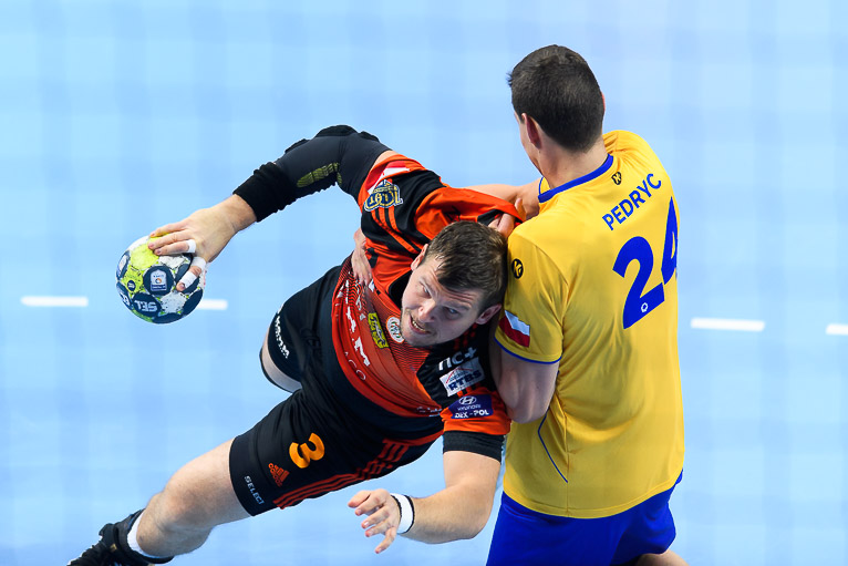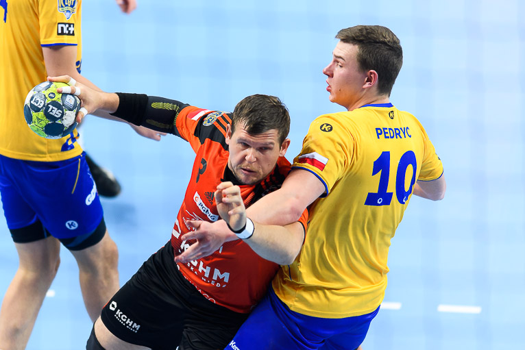 W drugiej połowie na pierwszą bramkę czekaliśmy blisko trzy minuty, zdobył ją Oleksandr Kyrylenko. W 35. minucie czerwoną kartkę za faul na Tomaszu Pietruszko ujrzał Rafał Jamioł, trzy minuty później zawodnik, który był faulowany również otrzymał czerwoną kartkę, jednak w przeciwieństwie do swojego przeciwnika z gradacji kar. Miedziowi w 40. minucie osiągnęli dziesięciobramkową przewagę – 25:15, a znakomite zawody rozgrywał Dawid Przysiek. Lubinianie bawili się grą i zdobywali kolejne bramki, zwyciężając ostatecznie bardzo pewnie różnicą dziesięciu bramek.