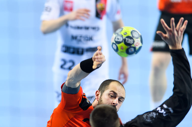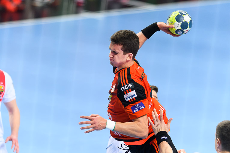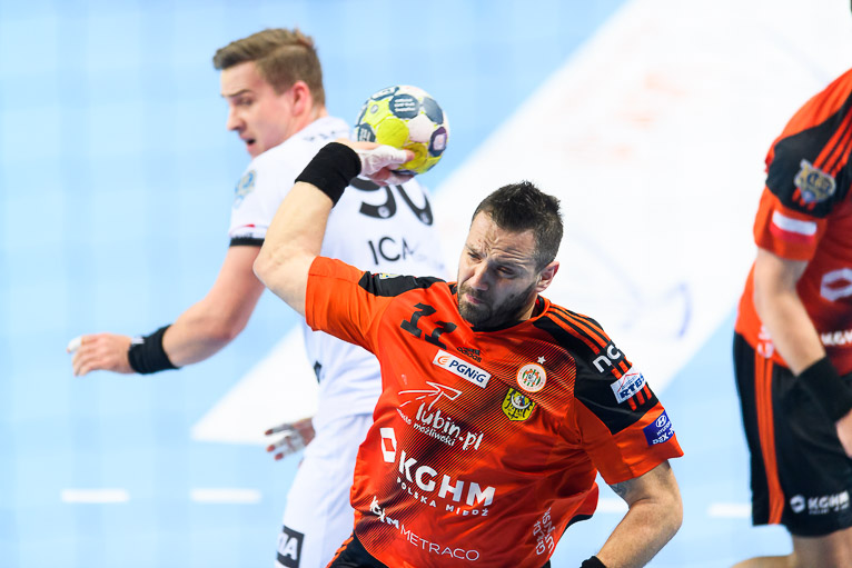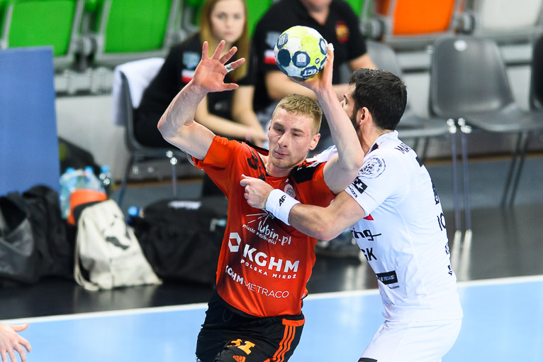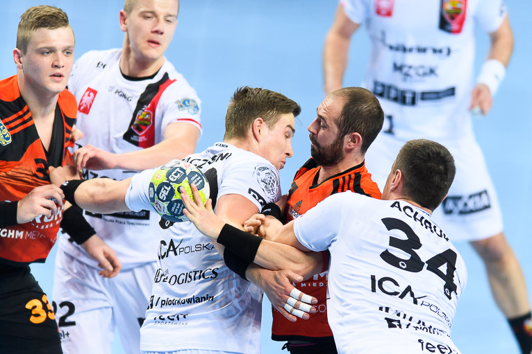 Lubinianie źle weszli mecz, zdobywając pierwszą bramkę dopiero w piątej minucie za sprawą Arkadiusza Moryty. W tym momencie goście mieli na swoim koncie już trzy bramki. Miedziowi szybko się otrząsnęli i doprowadzili do remisu po 3. W dziesiątej minucie lubinianie wyszli na pierwsze prowadzenie, po atomowym rzucie z drugiej linii w wykonaniu Mikołaja Szymyślika. Później było jeszcze lepiej. Po kwadransie na tablicy wyników mieliśmy 9:6 dla gospodarzy. Ton pierwszej części spotkania nadawali Arkadiusz Moryto po stronie Zagłębia i Stanisław Makowiejew po stronie Piotrkowianina. Lubinianie ostatni kwadrans zagrali zdecydowanie lepiej od rywali, w bramce znakomicie radził sobie Jakub Skrzyniarz i do przerwy miedziowi prowadzili różnicą trzech bramek.