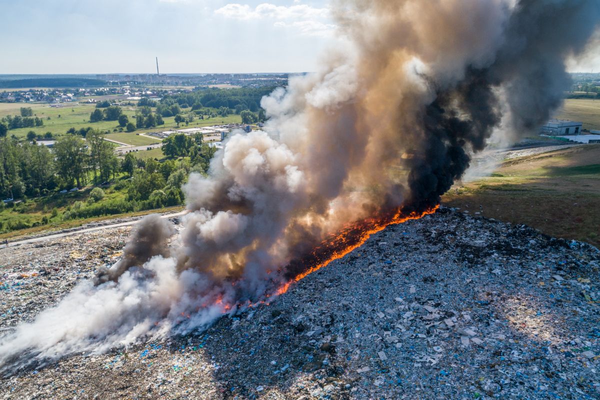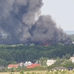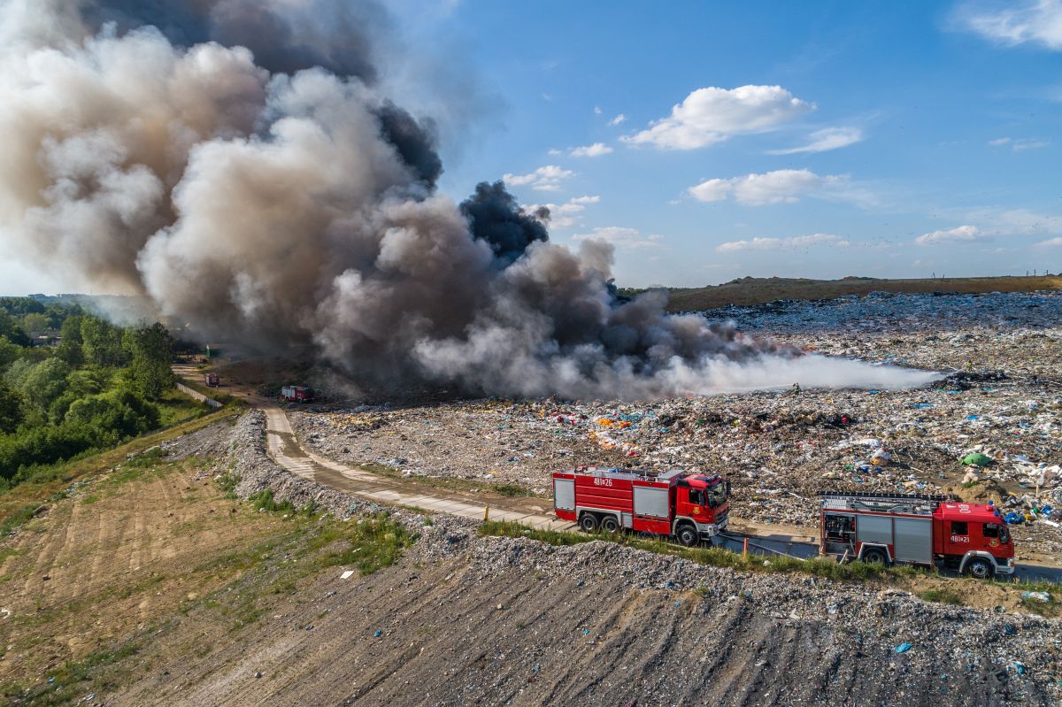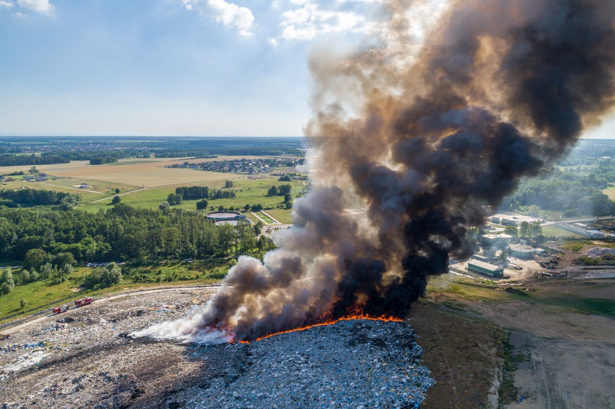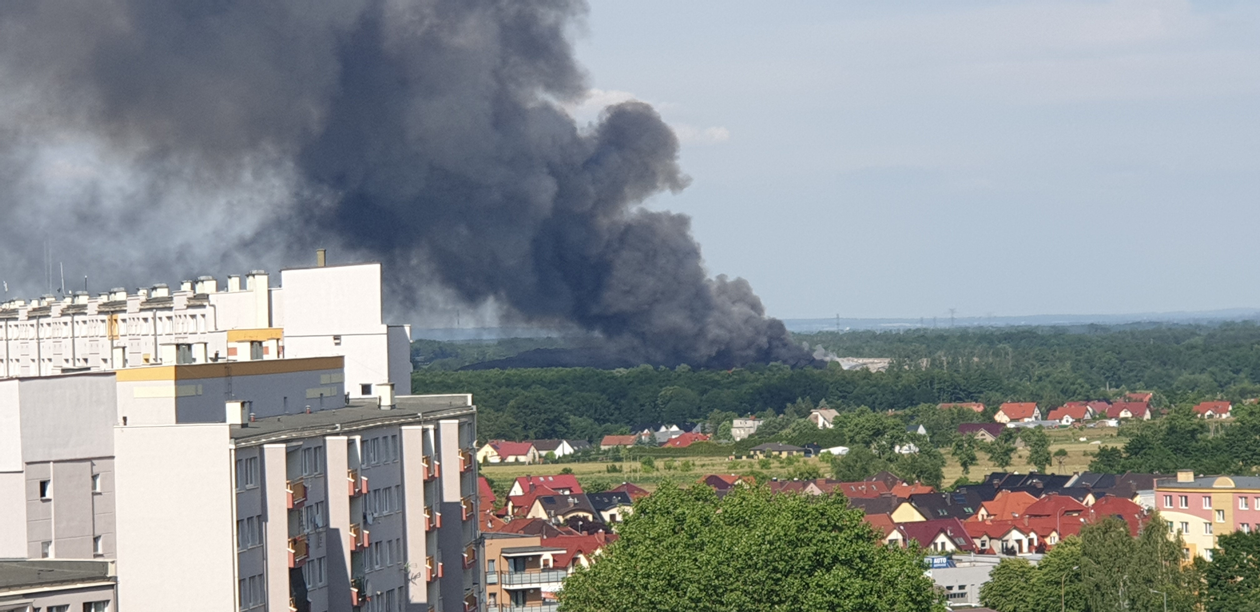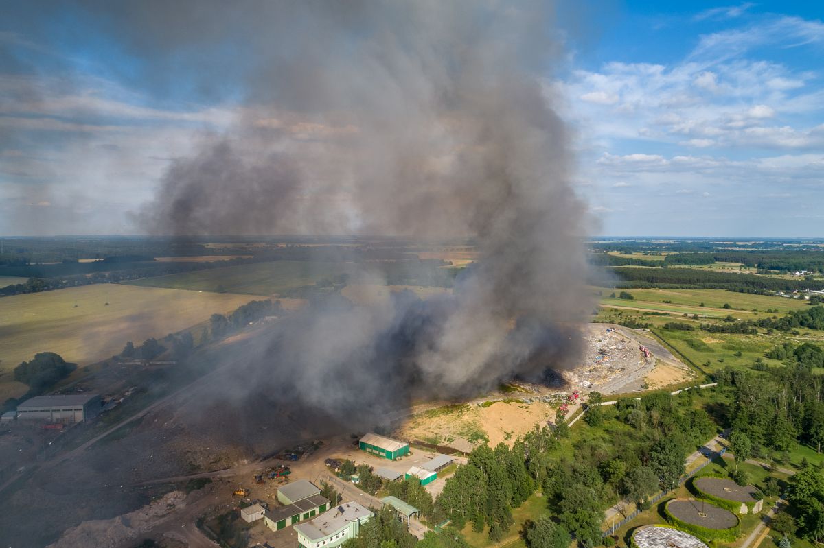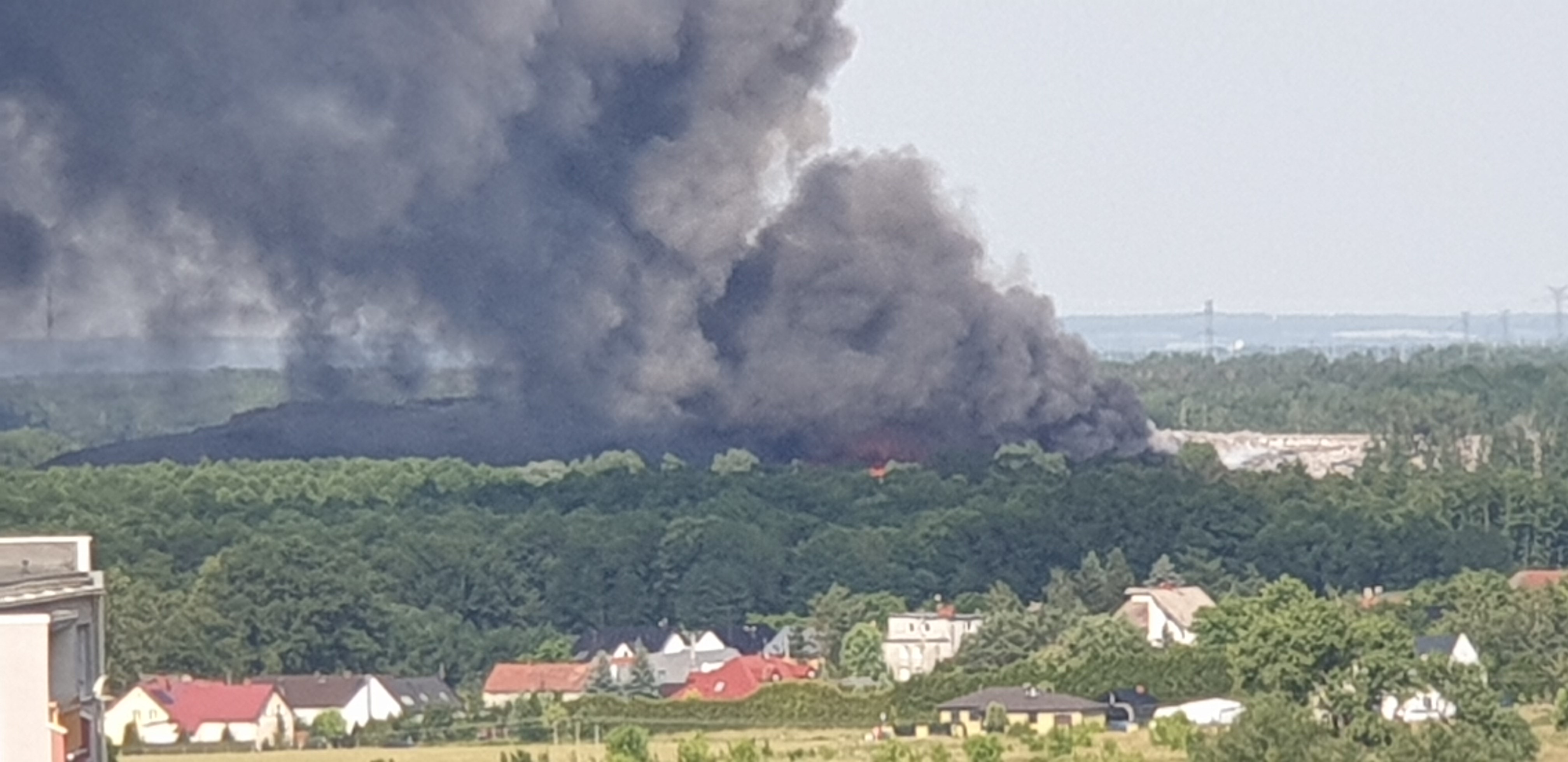 Gęsty słup czarnego dymu unosi się nad Lubinem. Płonie miejscowe składowisko odpadów.