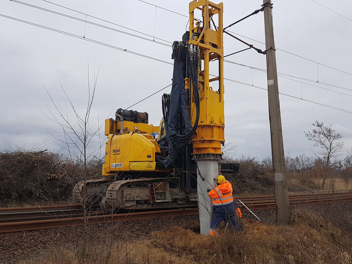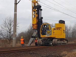 Palownica kolejowa przygotowuje konstrukcje nowej sieci trakcyjnej. Na 40-kilometrowym odcinku trasy z Legnicy do Rudnej wykonawca obecnie demontuje tory oraz prowadzi prace ziemne i przygotowuje przejazdy.