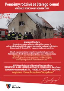W sobotę, 12 stycznia, ogień strawił poddasze, strych i dach domu w Starym Łomie, w którym mieszkała siedmioosobowa rodzina. Z żywiołem walczyło sześć strażackich zastępów. Na miejscu pojawił się wójt gminy, szefowa miejscowego GOPS-u i pracownicy zarządzania kryzysowego w urzędzie gminy. Z pomocą niemal natychmiast ruszyli też sąsiedzi pogorzelców, którzy wraz z sołtysami i radnymi z gminy przekazali im przedmioty codziennego użytki i pieniądze.