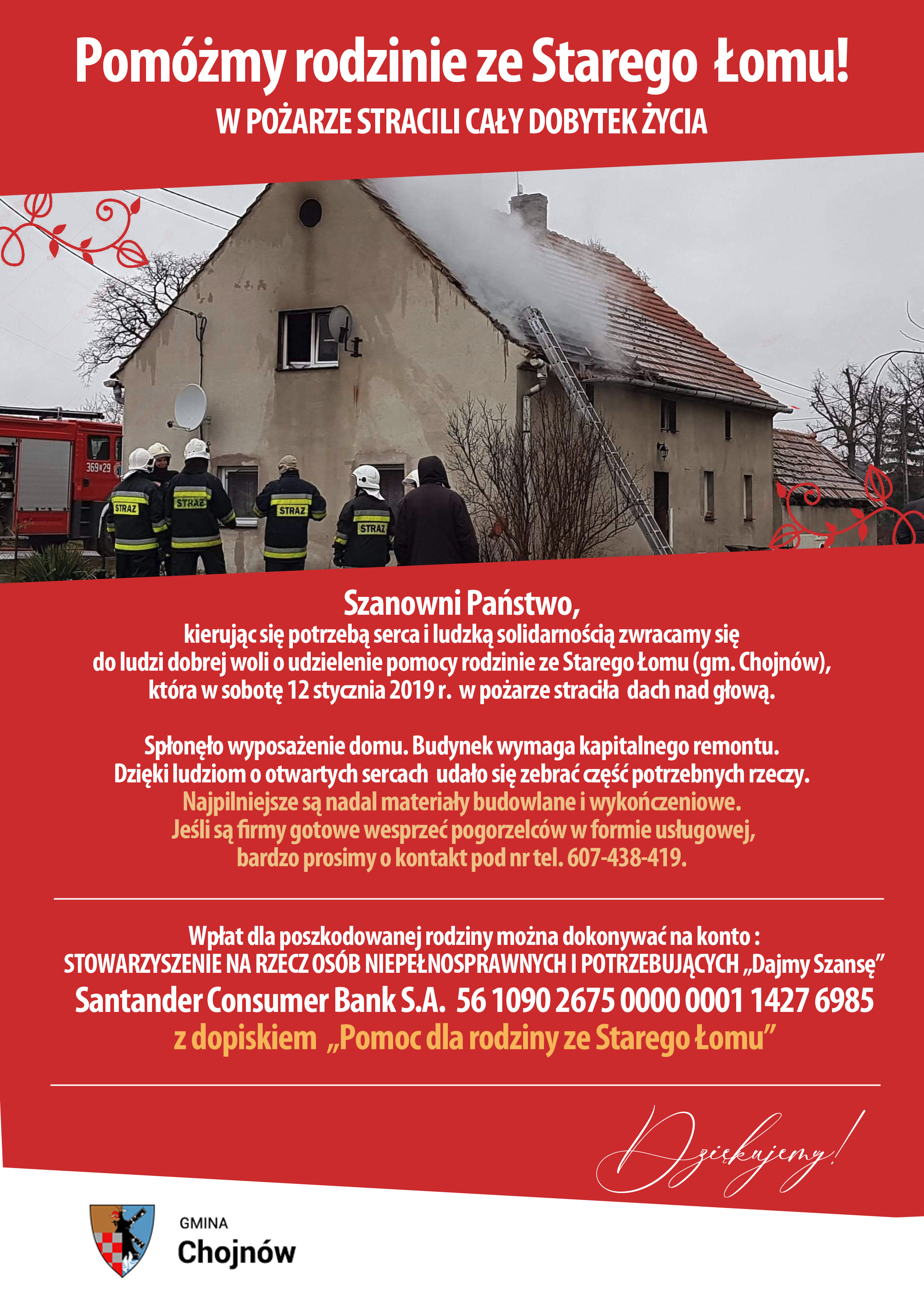 56 1090 2675 0000 0001 1427 6985 z dopiskiem „Pomoc dla rodziny ze Starego Łomu”.