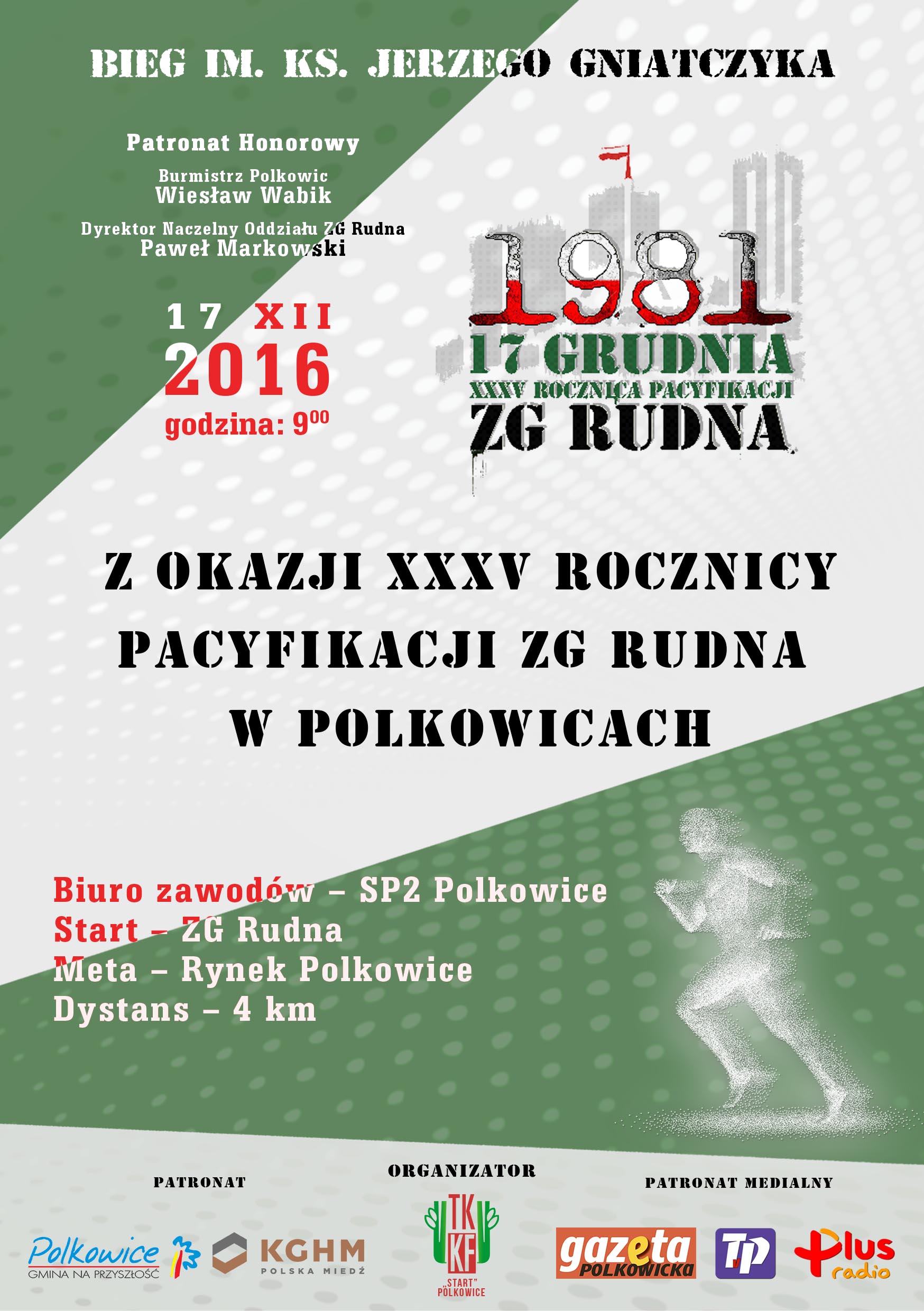 17 grudnia przypada 35. rocznica pacyfikacji Zakładów Górniczych Rudna. Z tej okazji zaplanowano kilka uroczystości, w tym I Bieg im. Księdza Jerzego Gniatczyka.