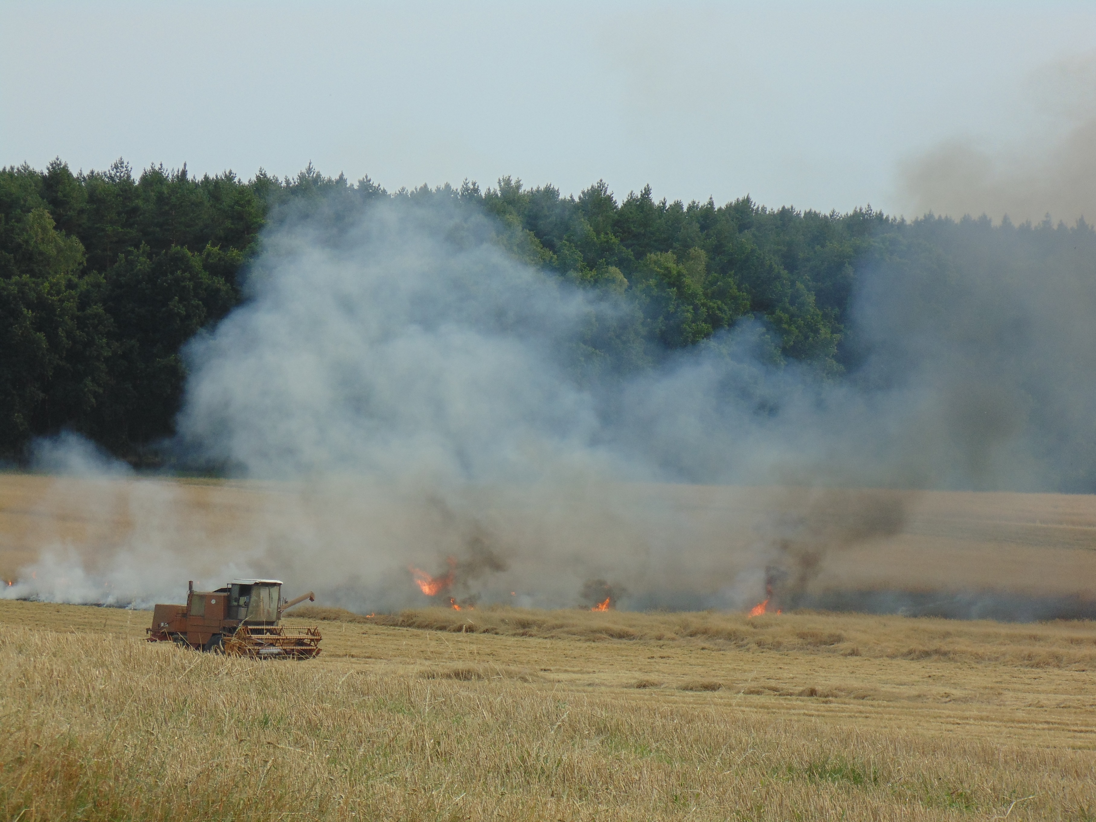 Na szczęście, pracujący tam ludzie przy koszeniu zboża zdążyli odjechać na bezpieczną odległość. Powiadomiliśmy straż pożarną, podobnie jak inni kierowcy, którzy przystawali na poboczu drogi. Akcja gaśnicza trwała około pół godziny. Ogień strawił ponad 2 ha zboża. Na razie nie wiadomo, co było przyczyną pożaru podczas trwających wtedy prac polowych. Służby ratownicze apelują o szczególną ostrożność.
