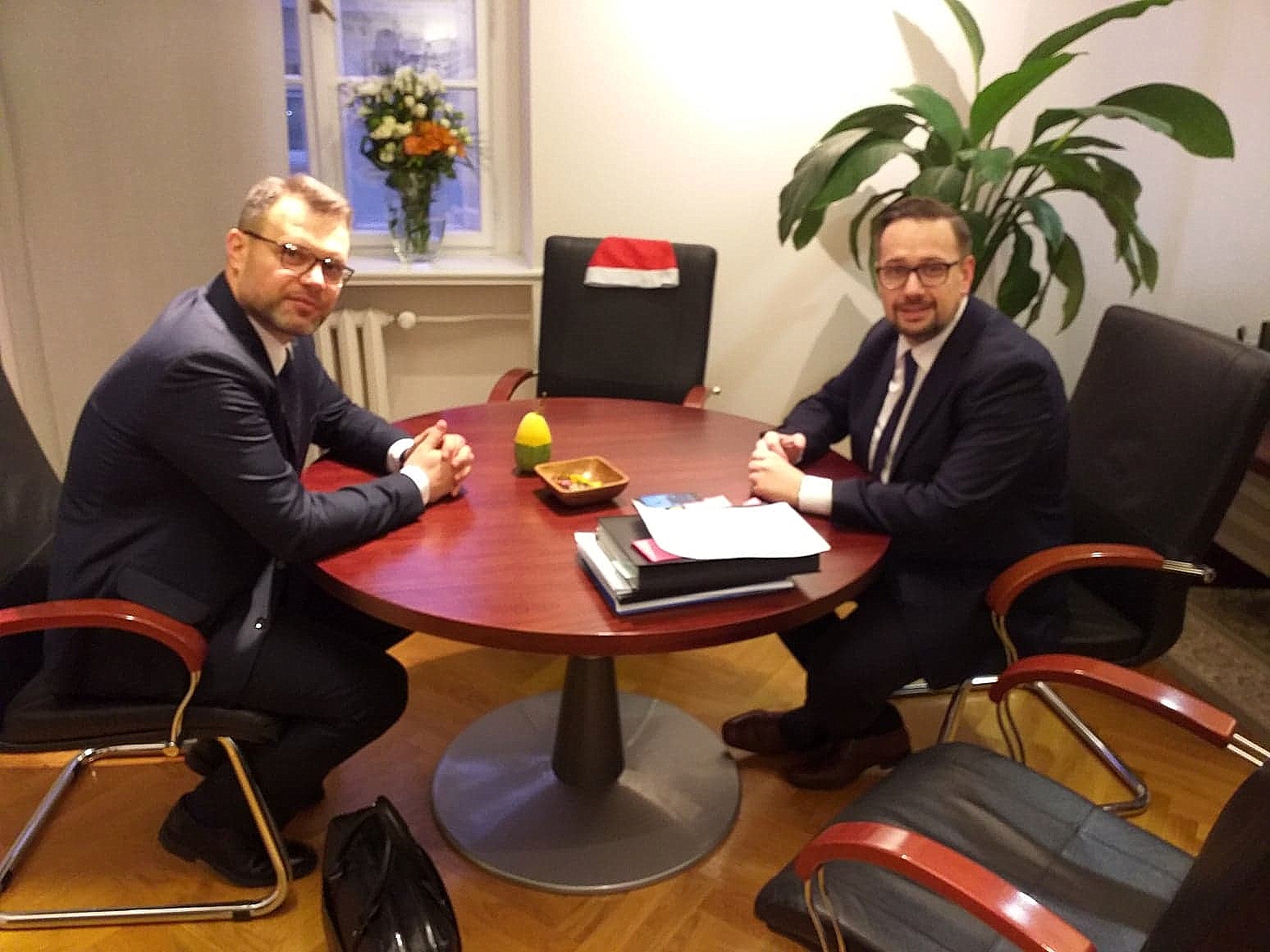 Na zdjęciu, Sebastian Sypko (z lewej) w rozmowie z burmistrzem Polkowic Łukaszem Puźnieckim.