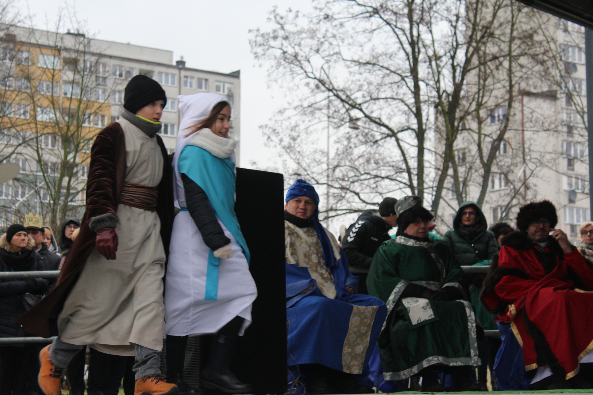 Trzej królowie poprowadzili swoje orszaki z trzech polkowickich parafii najpierw do szopki betlejemskiej w Rynku, a potem do miejskiego amfiteatru. Tam złożyli swoje dary.