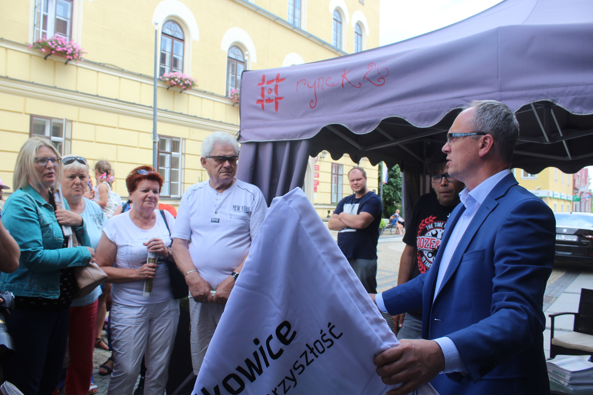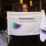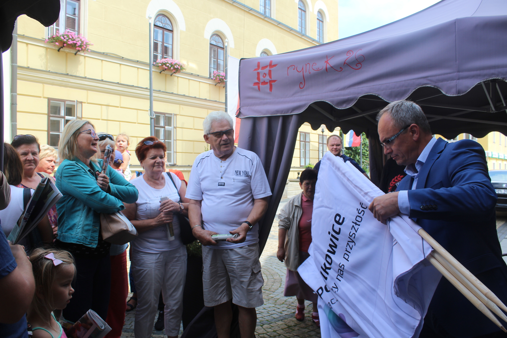 Dwieście parawanów z nowym logo Gminy Polkowice zostało rozdanych dziś przed ratuszem. Chętni ustawili się w długiej kolejce.