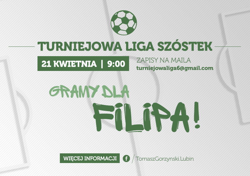 To będzie druga kolejka Turniejowej Ligi Szóstek, która odbędzie się w Lubinie. – Po pierwszych zorganizowanych dwa tygodnie temu odebraliśmy sporo ciepłych słów, jednak przede wszystkim mogliśmy wtedy pomóc Kubie Bielakowi. Teraz grać będziemy dla Filipka, dlatego serdecznie zapraszamy wszystkich w sobotnie przedpołudnie do sportowej rywalizacji. – mówi Tomasz Górzyński, pomysłodawca zawodów.