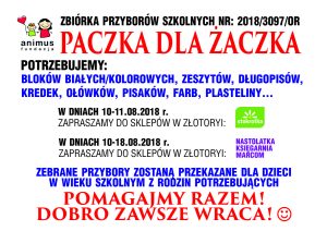 Mieszkańcy powiatu złotoryjskiego bardzo chętnie biorą udział w zbiórkach żywności organizowanych przez Fundację ANIMUS, w każdym roku bijąc rekordy zebranych produktów spożywczych. Wolontariusze liczą, że i tym razem darczyńcy obdarują wyprawkami szkolnymi co najmniej 30 dzieci – koszt jednej wyprawki szkolnej to około 349 zł. Pieniądze z dopiskiem „Dla Żaczka” można wpłacać w kwocie 20 zł, 50 zł lub dowolnej na konto Fundacji ANIMUS numer rachunku: 87 1020 3017 0000 2102 0211 9964
