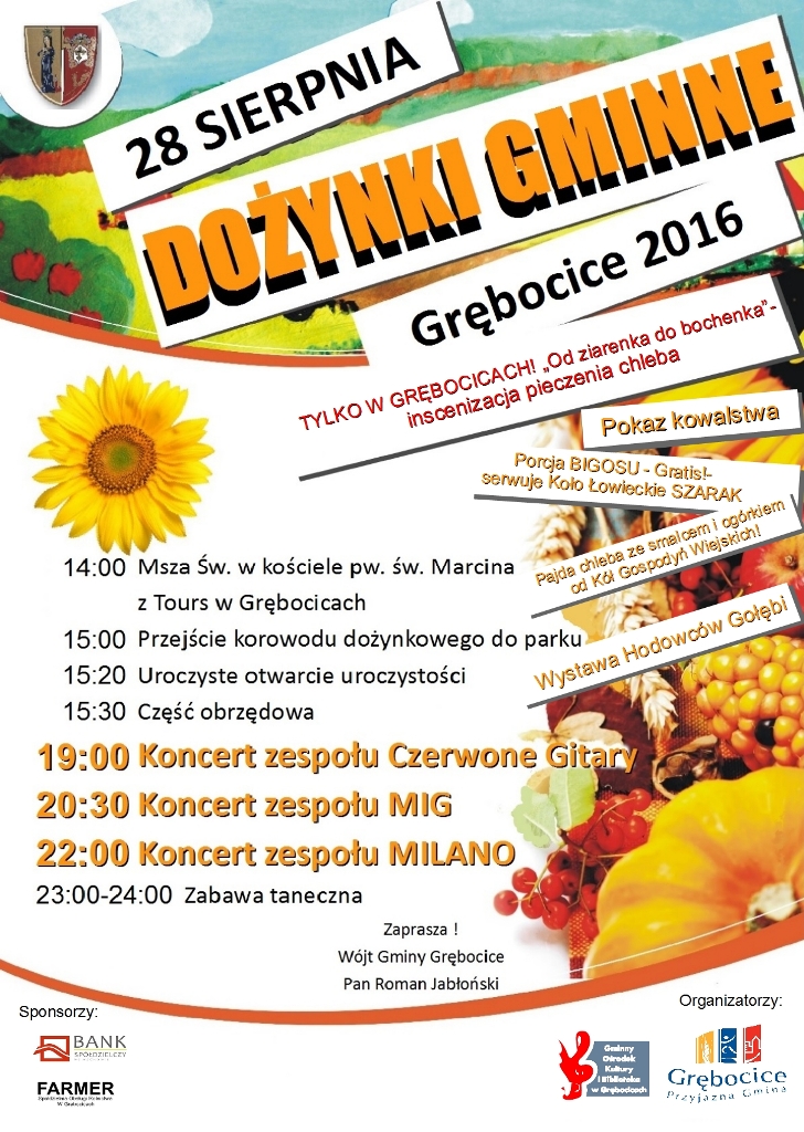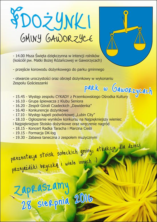 W sobotę 27 sierpnia dożynki odbywać się będą w Szklarach Dolnych. Zabawa potrwa od godziny 15:00 do 1:00 w nocy. Przygotowano m. in. występ kabaretu Ale Baby, koncert zespołu Avangarde i program muzyczny dla dzieci ,,Piosenki z plecaka”. W niedzielę zaś na dożynkowych zabawach będą bawić się mieszkańcy Grębocic, Gaworzyc oraz Jakubowa Lubińskiego.