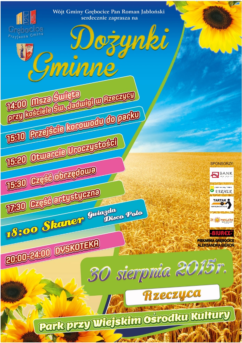 29 sierpnia świętować będą rolnicy w Radwanicach, a dzień później, tj. 30 sierpnia – w Rzeczycy, gmina Grębocice. 5 września odbędzie się dożynkowe święto w Koźlicach, gmina Gaworzyce, połączone z jubileuszem zespołu Dawidenka (program wkrótce).