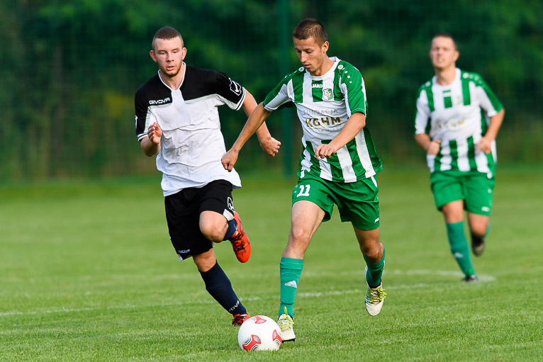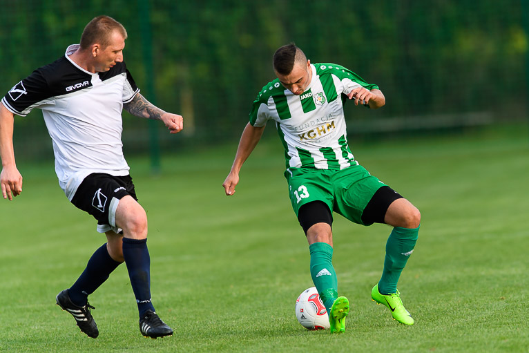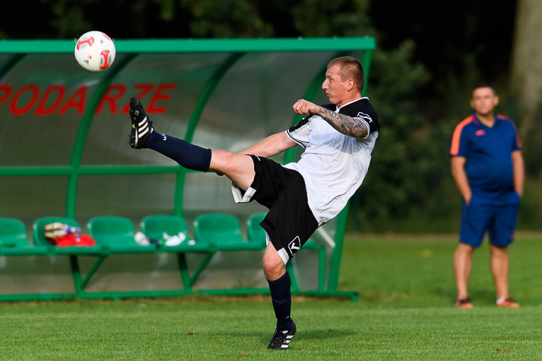 Sobotni goście rozpoczęli mecz w nieco innym ustawieniu niż ostatnio. Niespodzianką było wystawienie na skrzydłach powracających do klubu wychowanków Pawła Pelca i Eryka Adamka. Oboje zagrali dobre zawody i pokazali, że rywalizacja o miejsce w składzie będzie bardzo zacięta. Pierwszą szansę na gola miał Kotlarz po kombinacyjnej akcji całego zespołu. Jednak jego strzał instynktownie obronił Piotr Krysa. Najlepszą okazję na przełamanie bezbramkowego wyniku do przerwy miał Wojciech Jurak po podaniu Kotlarza, lecz uderzył za mało precyzyjnie i Krysa znów był górą. Gospodarze głównie próbowali wykorzystać skrzydłowego Macieja Bara, ale nie przynosiło im to żadnych efektów.