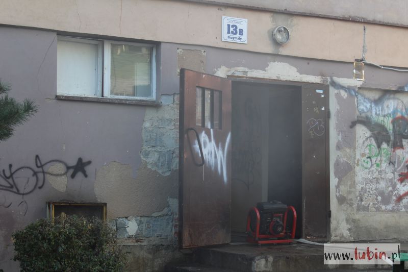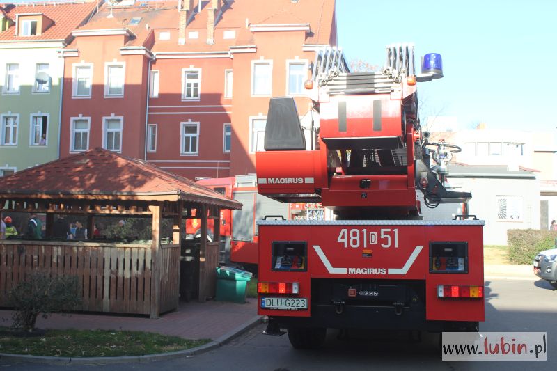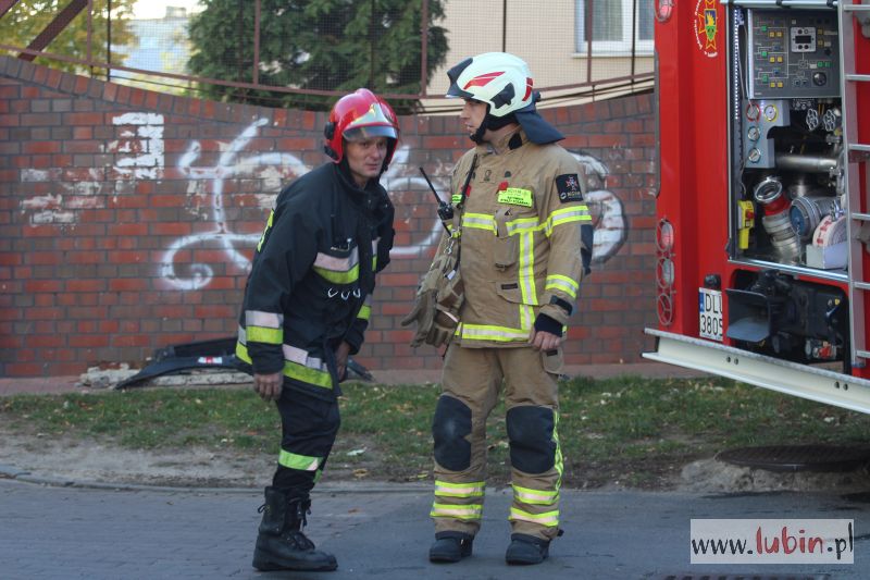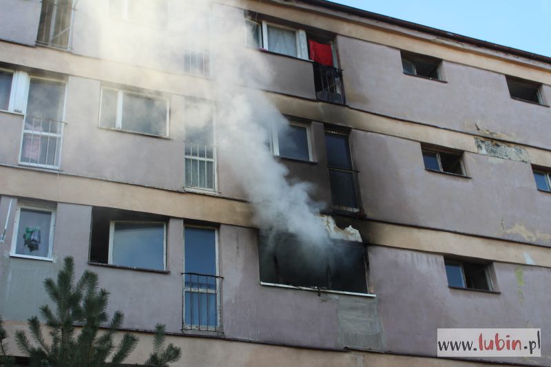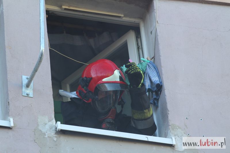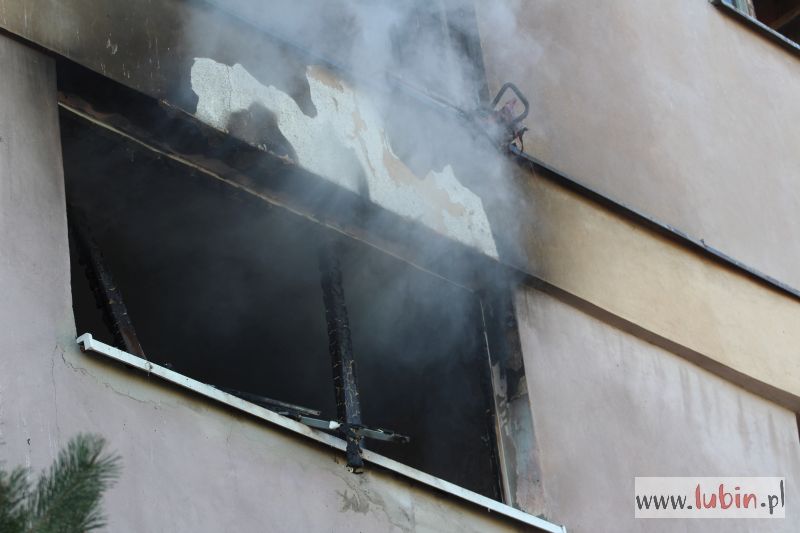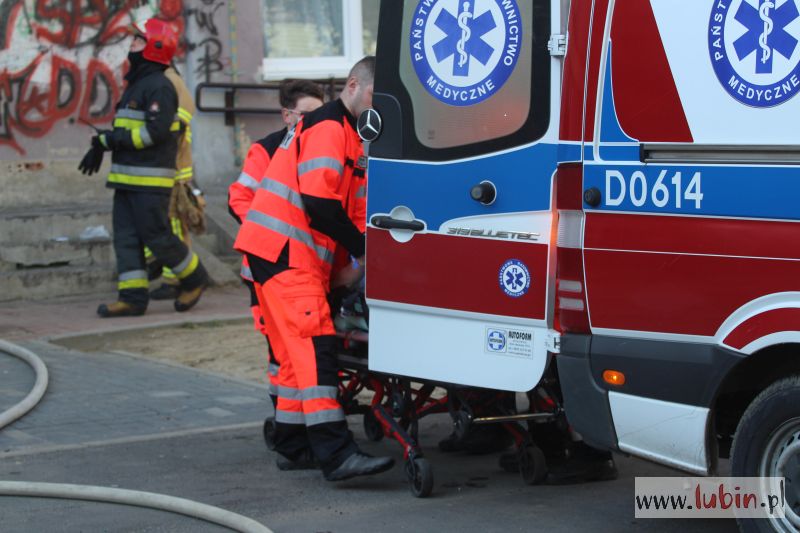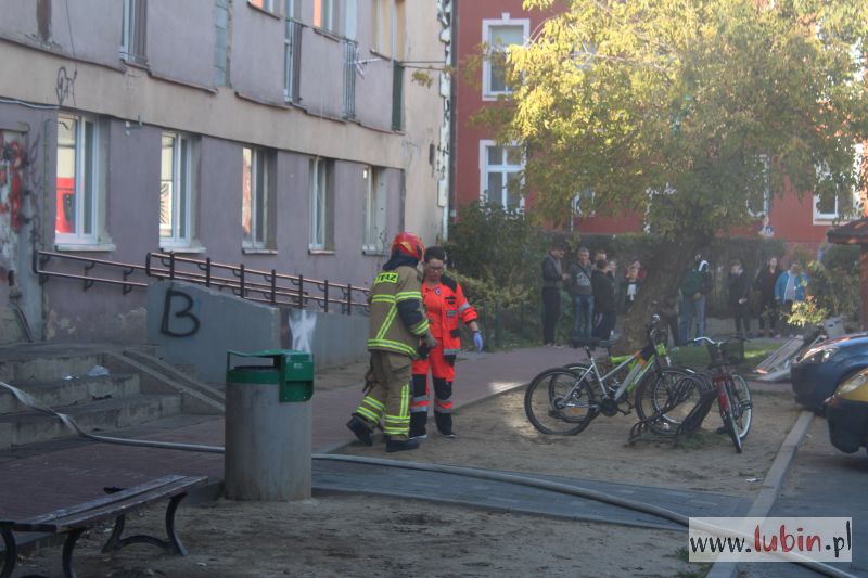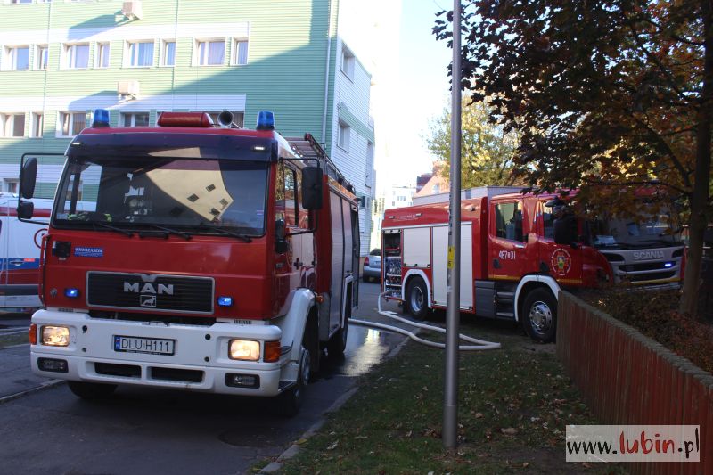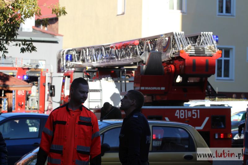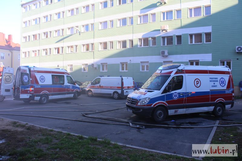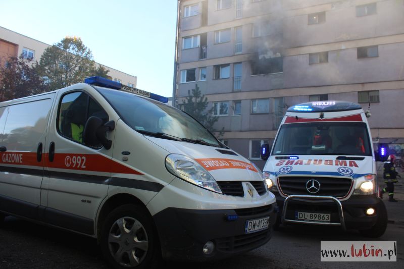Pożar mieszkania na drugim piętrze w budynku przy ul. Drzymały 13B w Lubinie. Na miejscu straż pożarna i pogotowie. Część lokatorów wyszła o własnych siłach, część została ewakuowana.