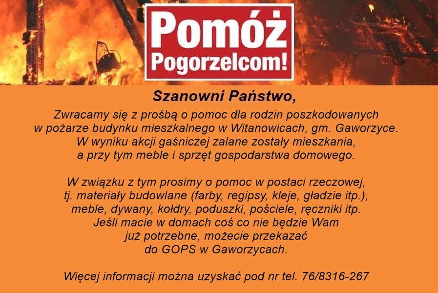 Materiały budowlane, meble, dywany, koce, pościel, ręczniki – to można dostarczyć do Gminnego Ośrodka Pomocy Społecznej w Gaworzycach. Zostaną przekazane rodzinom poszkodowanym w pożarze budynku w Witanowicach.