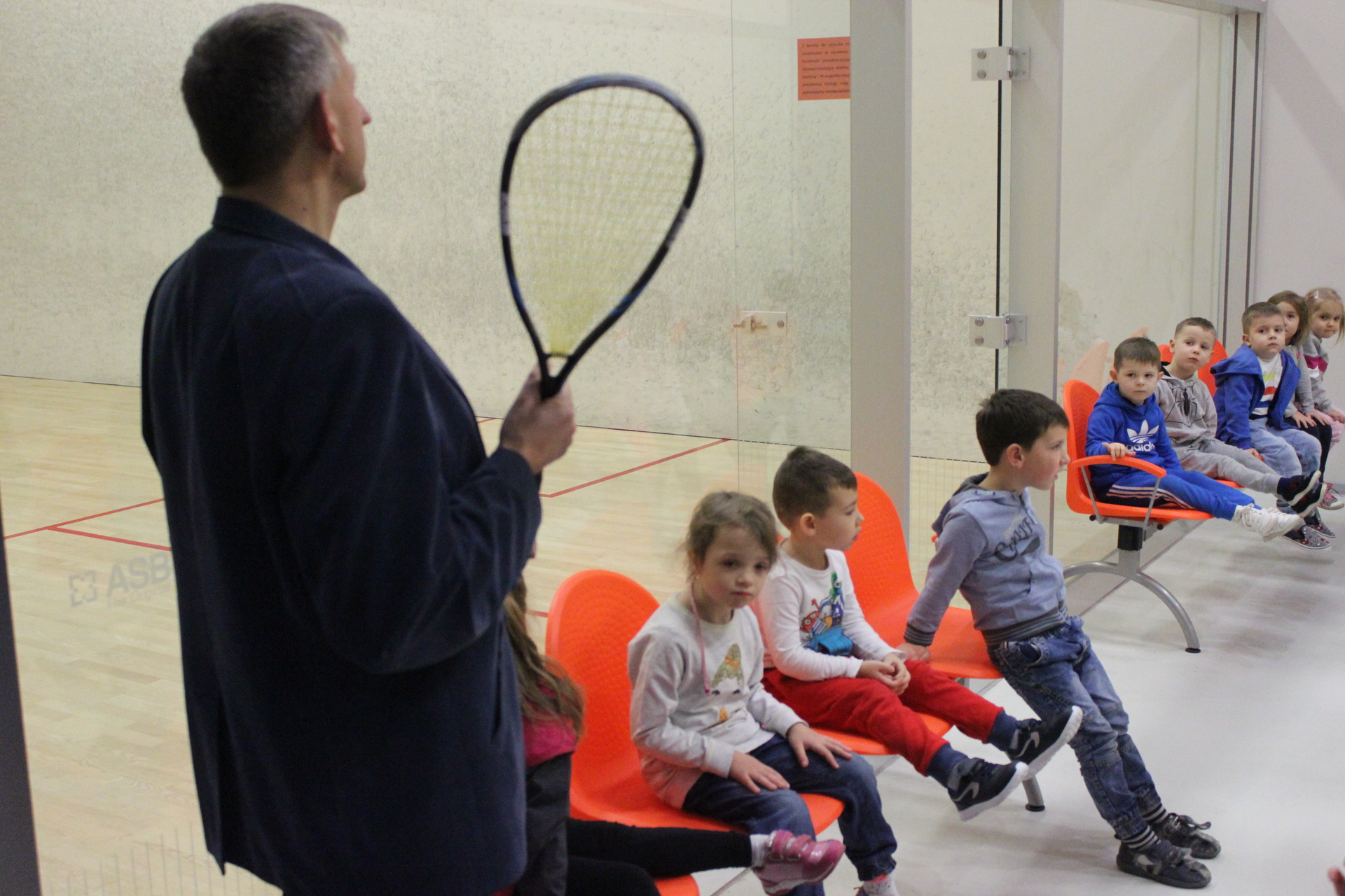 Przedszkolaki zaczęły od zwiedzania obiektu. Dzieci zobaczyły m.in. sale konferencyjną, salę VIP oraz korty do squasha. Na końcu było zwiedzanie szatni sportowców, gdzie dzieci przebrały się w stroje, po czym przyszedł czas na kulminacyjny moment.