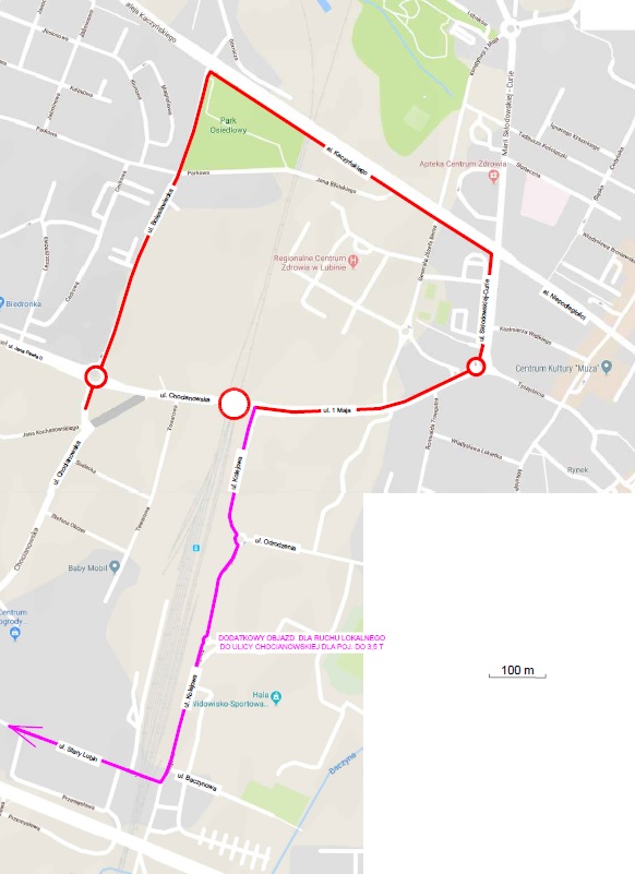 Przejazd na 1 Maja będzie zamknięty przez około cztery tygodnie. Objazd poprowadzony zostanie przez aleję Lecha Kaczyńskiego oraz przez przejazd kolejowy na Starym Lubinie, który otwarty zostanie 22 lipca.