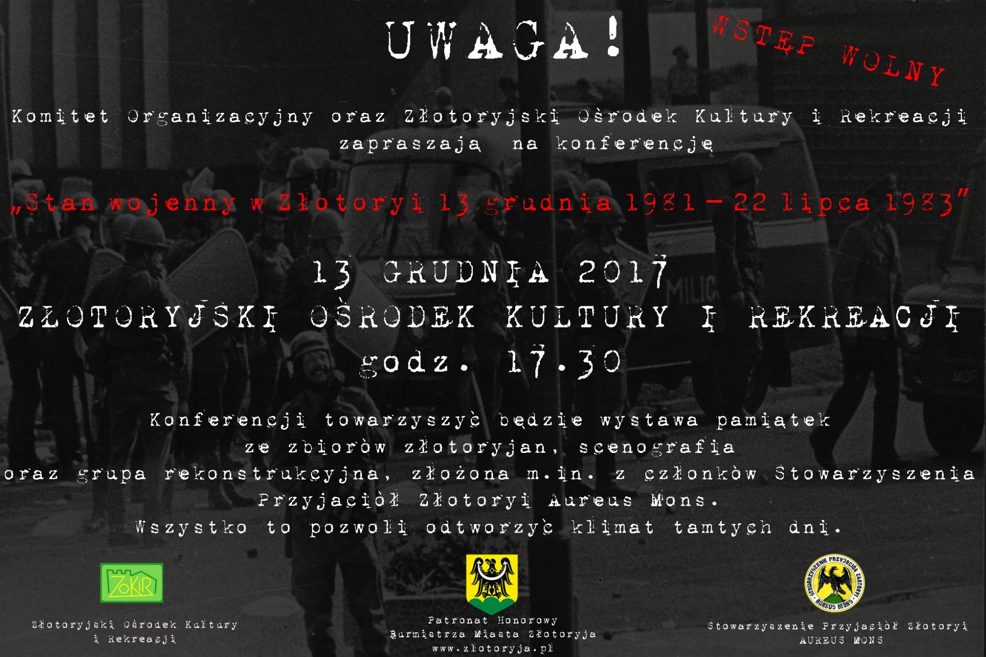 Konferencji towarzyszyć będzie wystawa pamiątek ze zbiorów złotoryjan, a scenografię zapewni grupa rekonstrukcyjna złożona m.in. z członków Stowarzyszenia Przyjaciół Złotoryi Aureus Mons, która ma pomóc w odtworzeniu klimatu grudnia 1981 r.