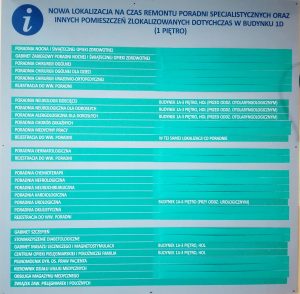 Tablica pojawiła się już przy wejściu głównym. Pacjenci znajdą na niej informacje o tym, gdzie tymczasowo funkcjonują przychodnie neurogoliczne dla dorosłych i dzieci, alergologiczna ora urologiczna. Nowe miejsce znalazł również gabinet masażu leczniczego oraz centrum opieki pielęgniarskiej i położniczej Familia.