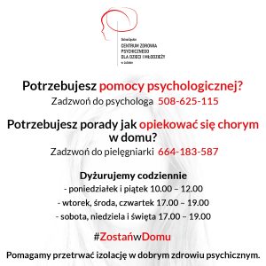 Pomoc telefoniczną można uzyskać dzwoniąc pod numery telefonów: psycholog – 508625115, pielęgniarka – 664183587.