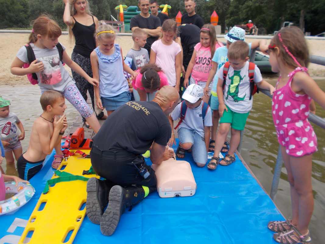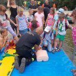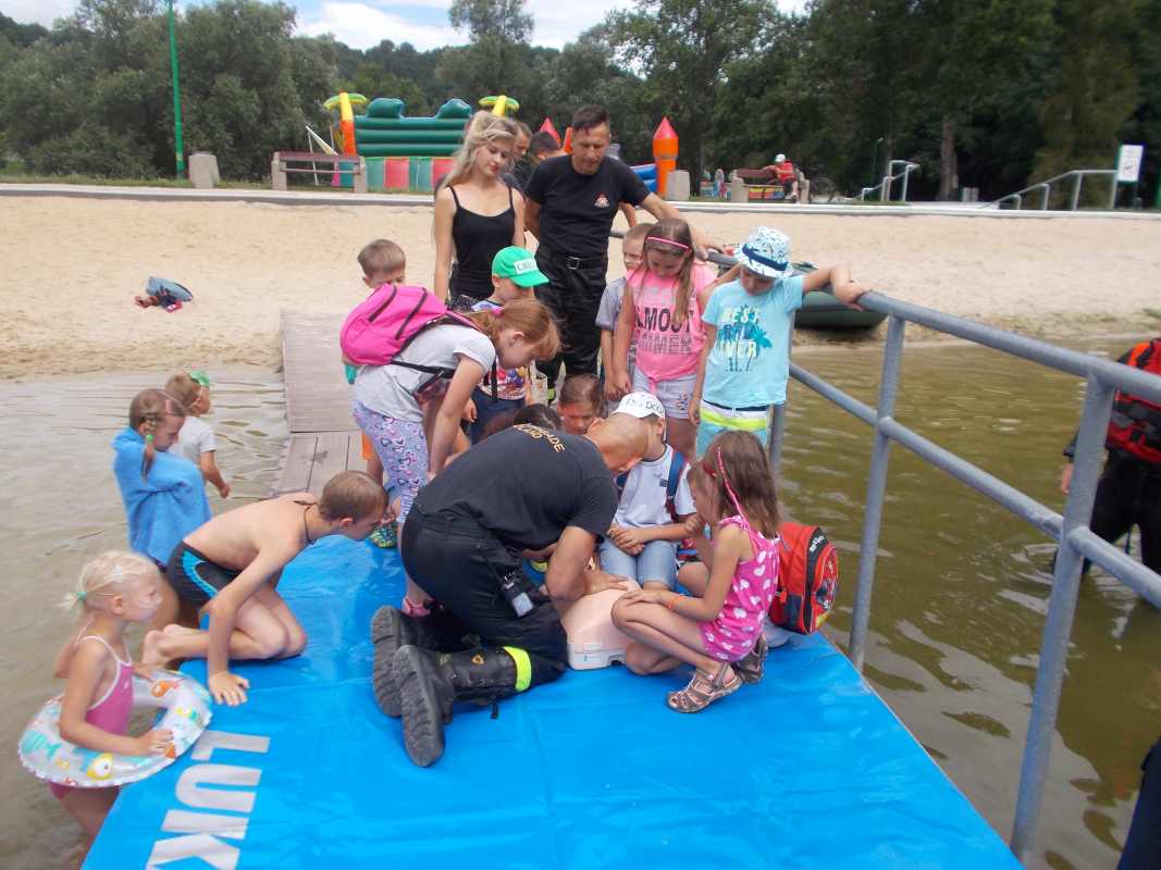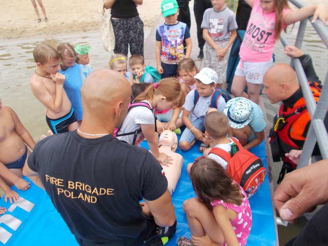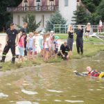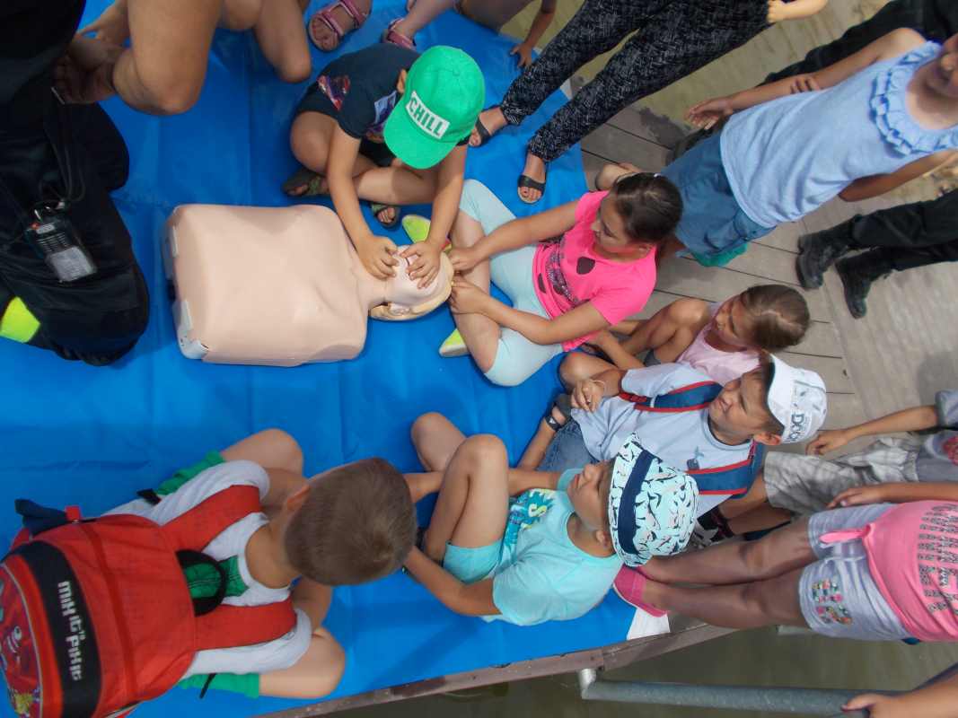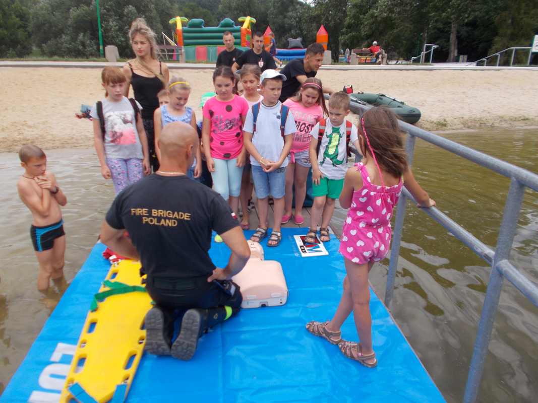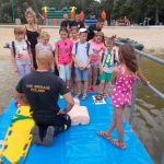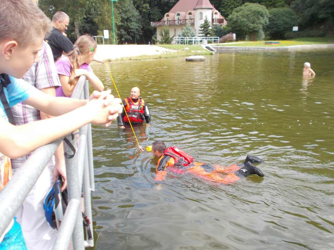 Ratownicy z dziećmi na specjalnym pontonie przeprowadzili symulowany pokaz wyciągnięcia z wody tonącego. Na brzegu natomiast odbywała się akcja reanimacyjna osoby, która nie odzyskała jeszcze przytomności. Oczywiście był to tylko manekin, na którym każdy chętny mógł przećwiczyć całą procedurę postępowania w takim przypadku.