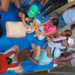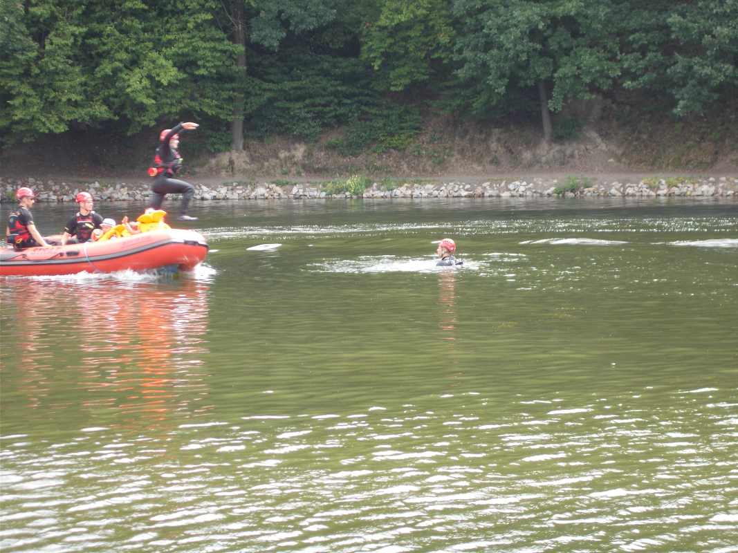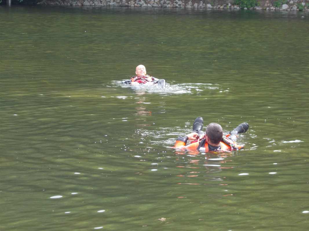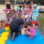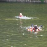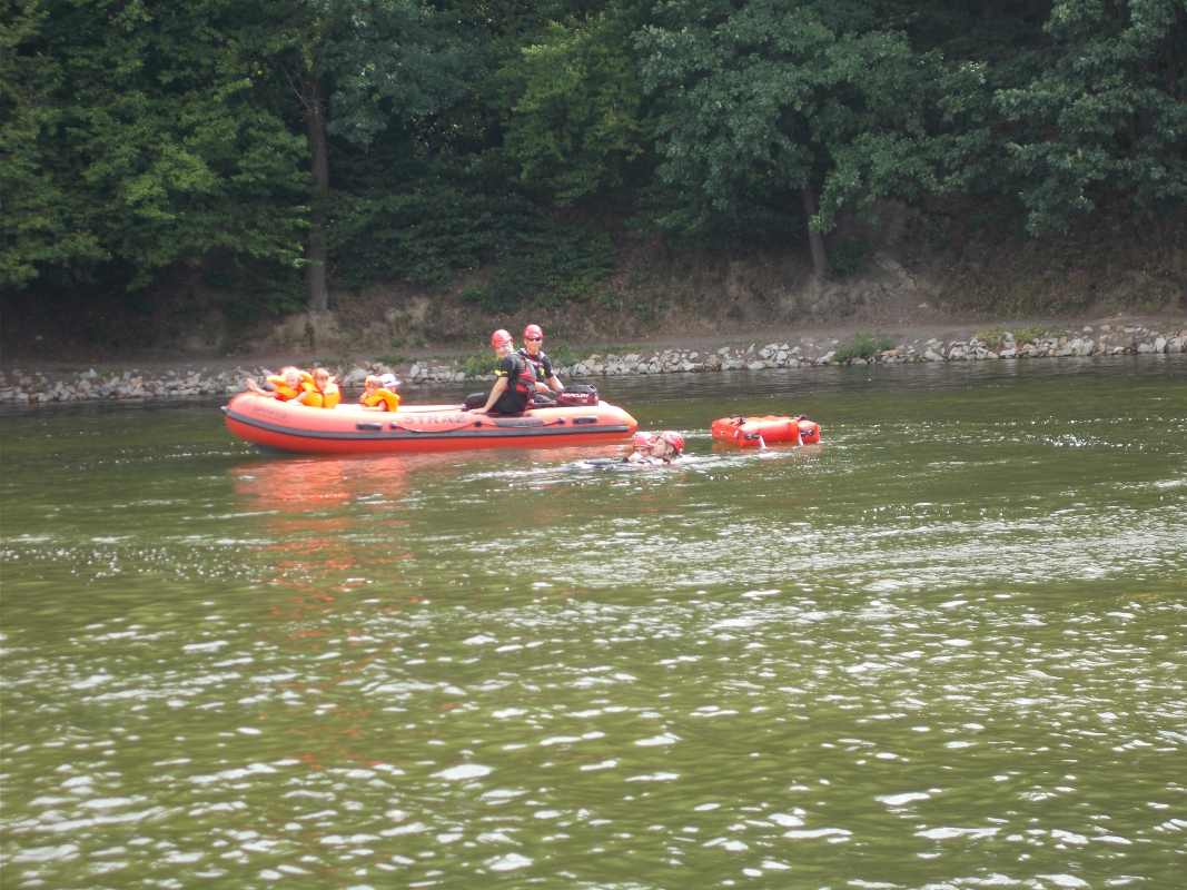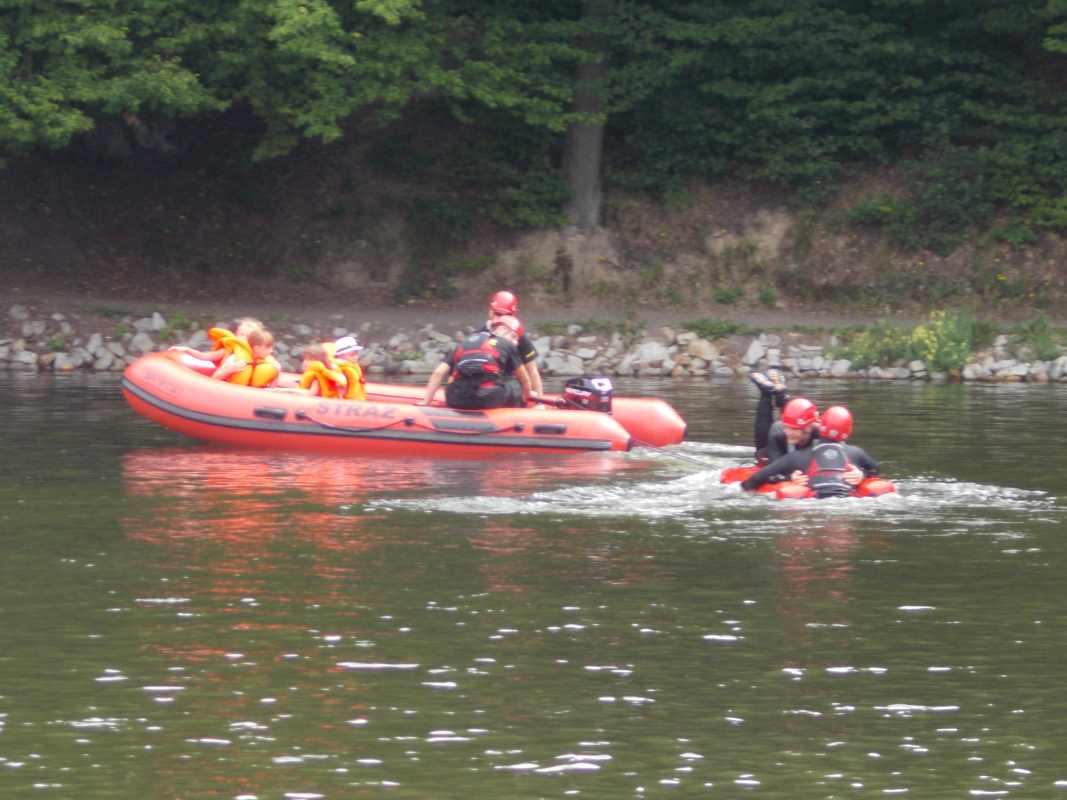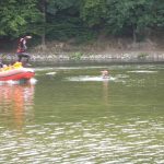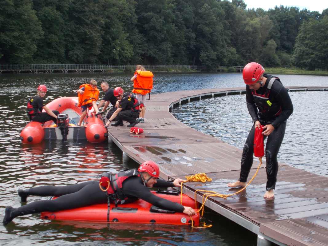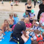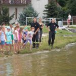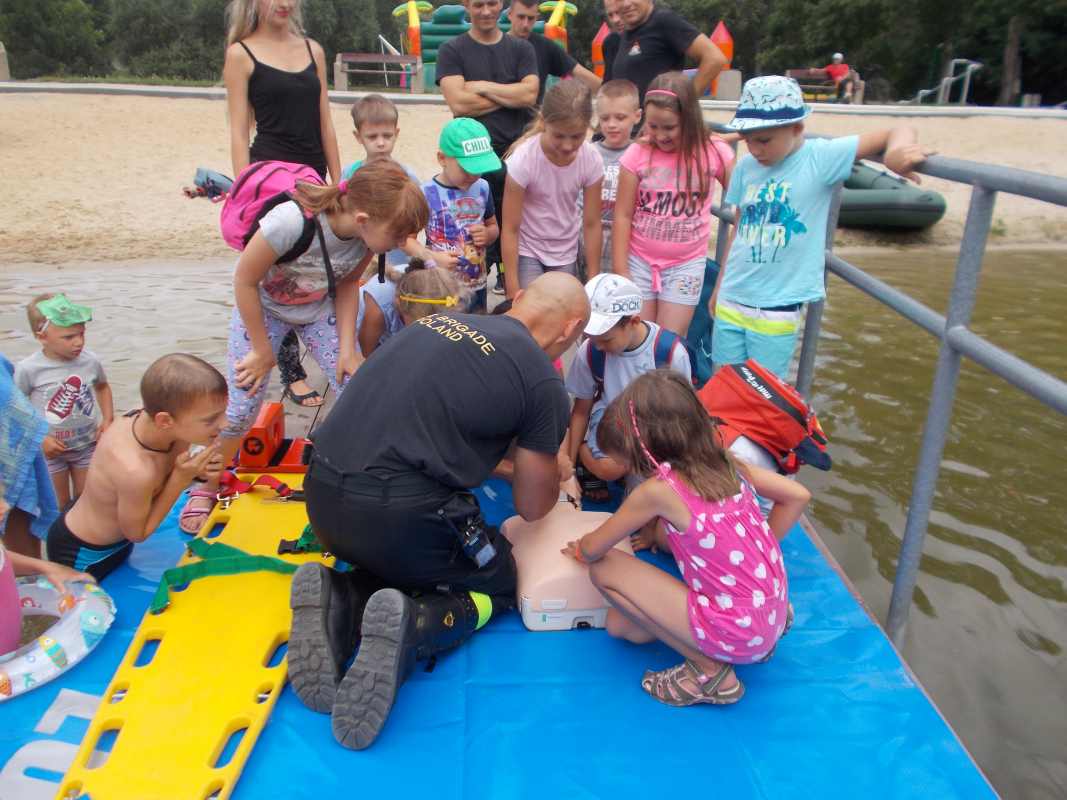 Ratownicy z dziećmi na specjalnym pontonie przeprowadzili symulowany pokaz wyciągnięcia z wody tonącego. Na brzegu natomiast odbywała się akcja reanimacyjna osoby, która nie odzyskała jeszcze przytomności. Oczywiście był to tylko manekin, na którym każdy chętny mógł przećwiczyć całą procedurę postępowania w takim przypadku.