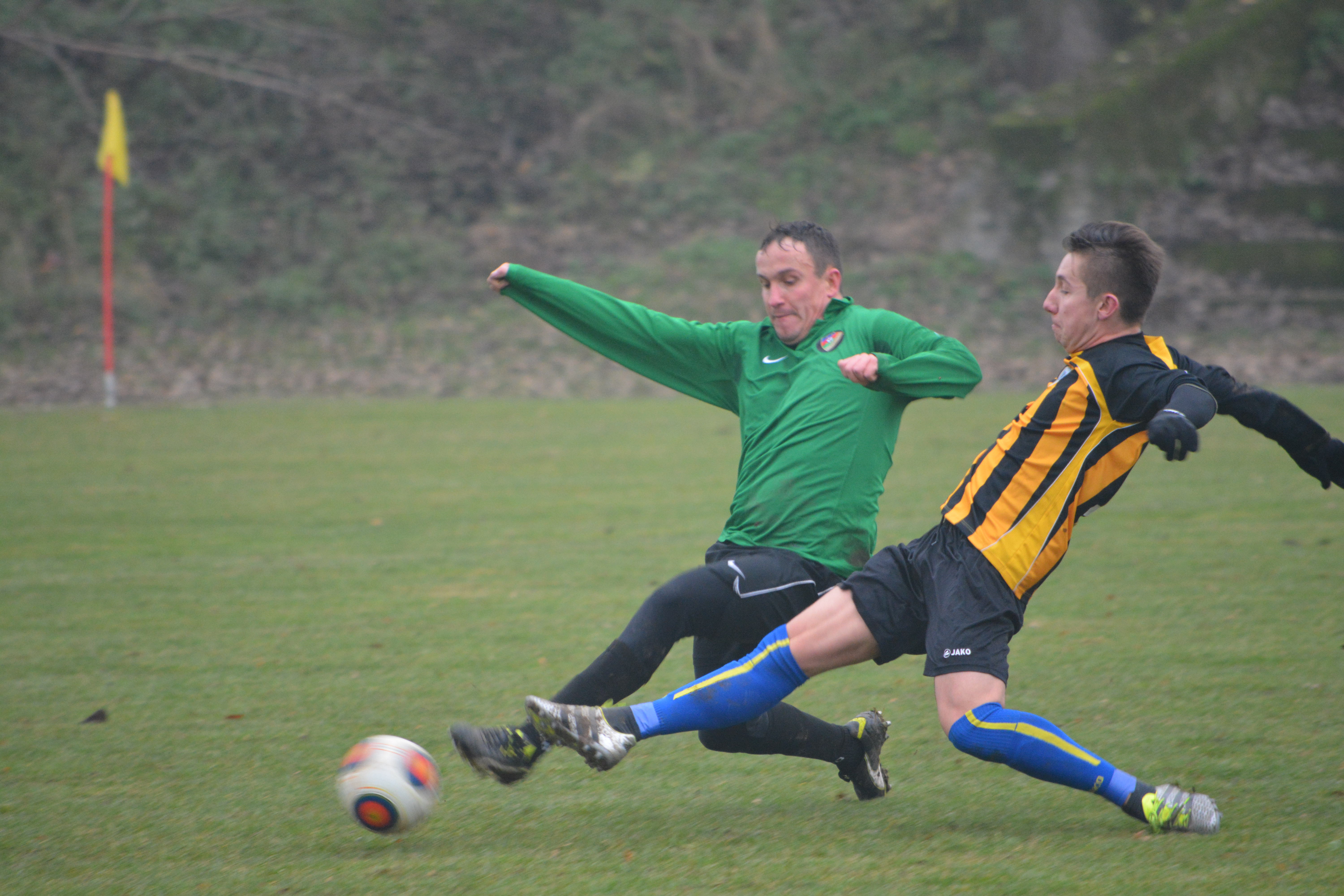 Jaworzanie dopięli swego w 33 minucie. Marcin Bagiński uderzeniem z kilkunastu metrów zdobył jedenastą bramkę w kampanii 2016/2017, a asystę zaliczył Kacper Grabarczyk. Jednak radość mogła trwać zaledwie kilka minut, ponieważ za chwilę mógł być ponownie remis. Zawodnika Huty we własnym polu karnym sfaulował Kamil Dunaj, a prowadzący zawody Piotr Łabędzki wskazał na „wapno”. Na szczęście Patryk Borek poradził sobie wyśmienicie z obroną tego rzutu karnego i Kuźnia dowiozła prowadzenia 2:1 do przerwy.