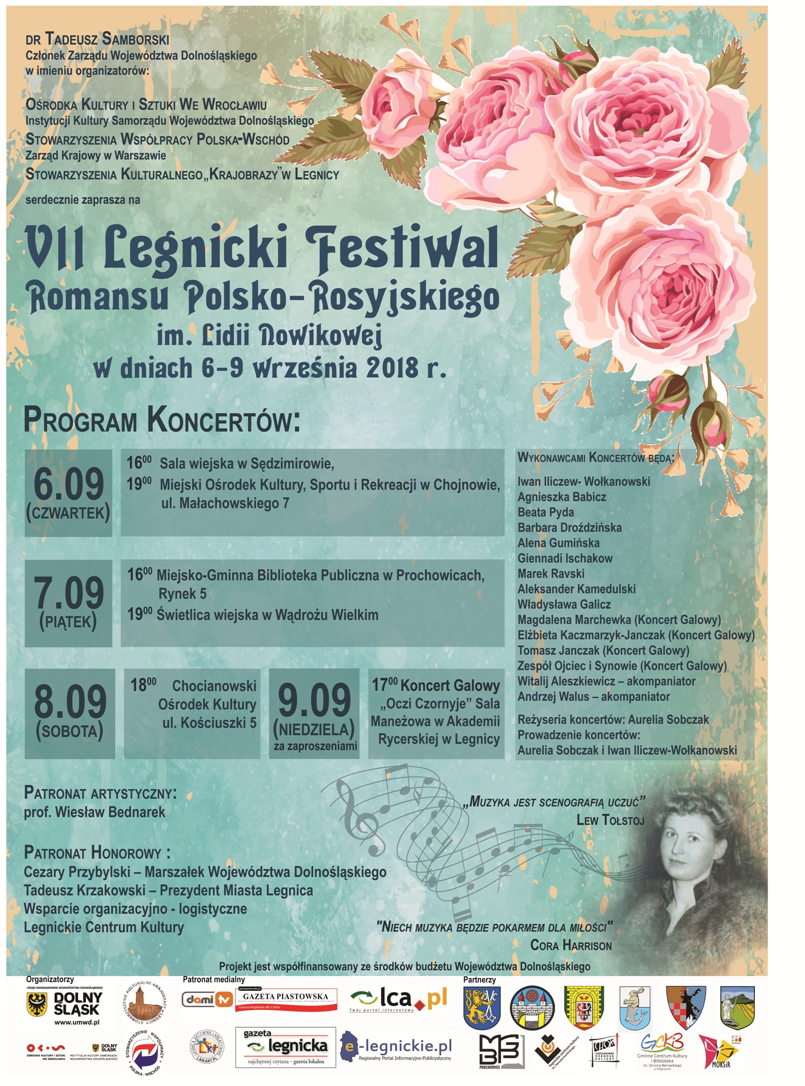Ośrodek Kultury i Sztuki we Wrocławiu, Stowarzyszenie Współpracy Polska-Wschód oraz Stowarzyszenie Kulturalne „Krajobrazy” w Legnicy zapraszają na VII Legnicki Festiwal Romansu Polsko-Rosyjskiego im. Lidii Nowikowej. W ramach tego kulturalnego wydarzenia przez cztery najbliższe dni w czterech powiatach naszego regionu będą odbywały się koncerty.
