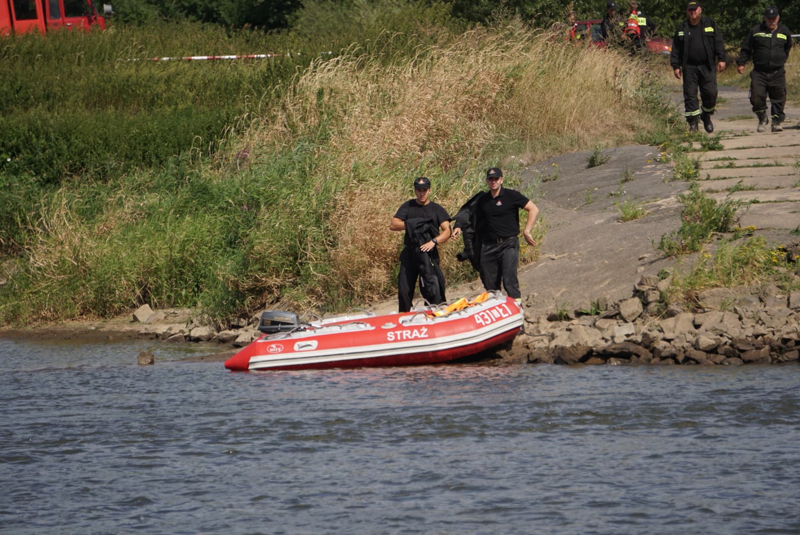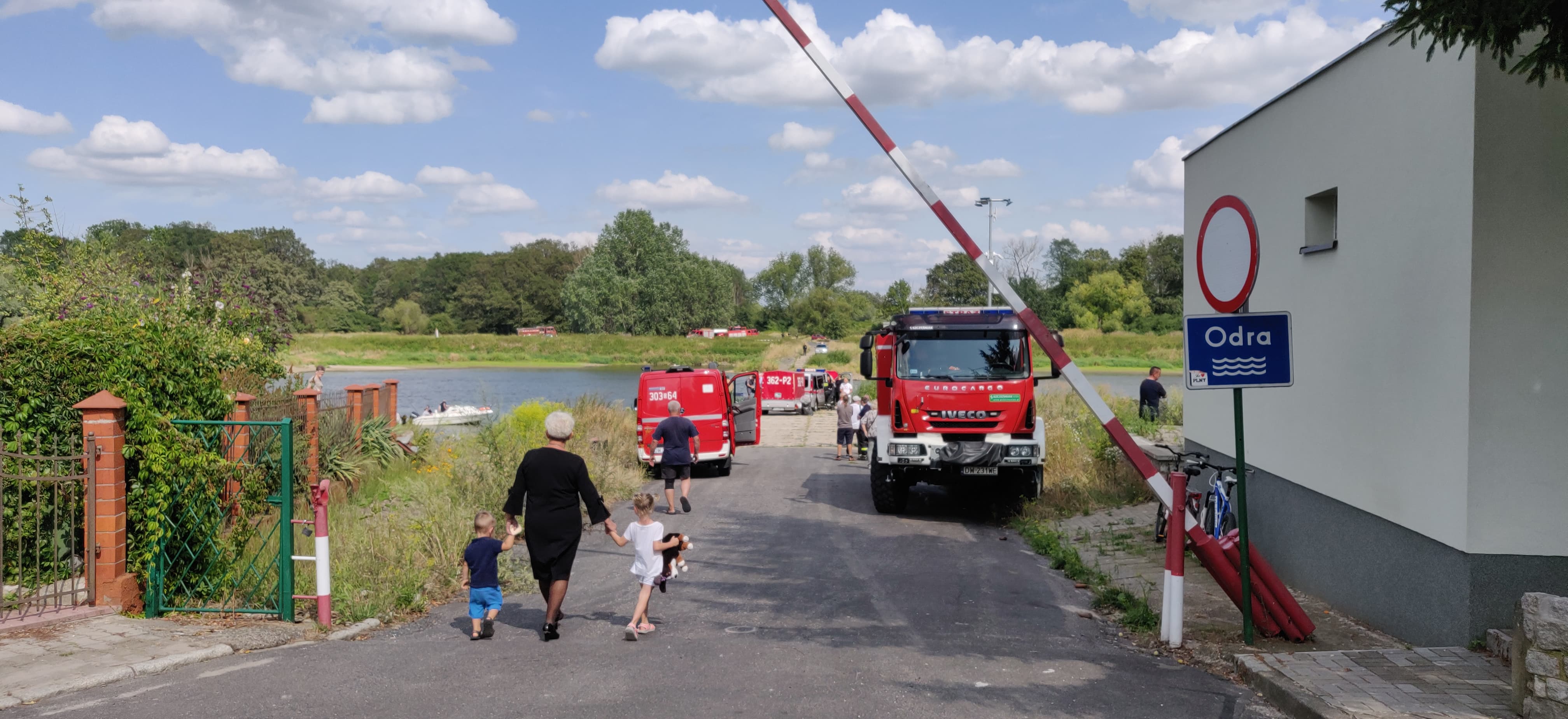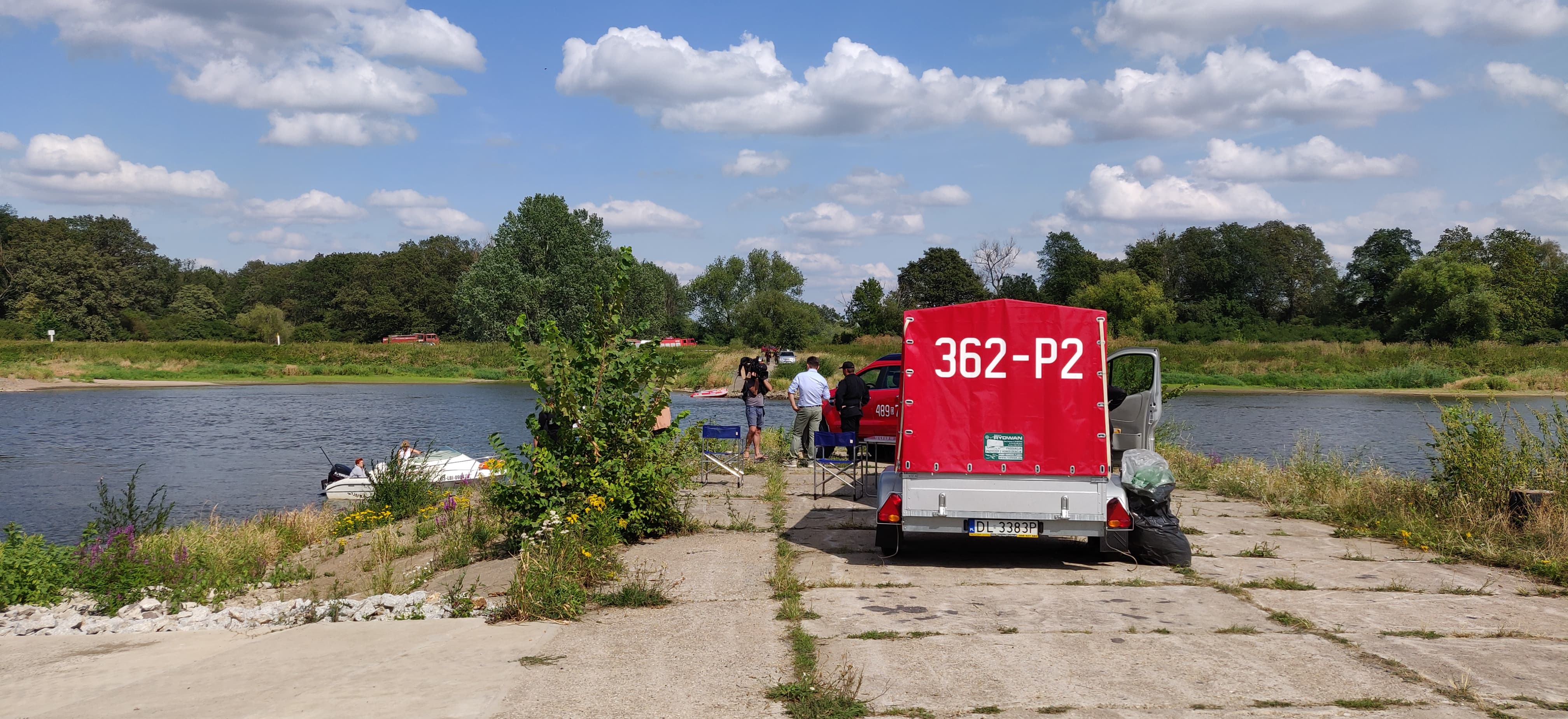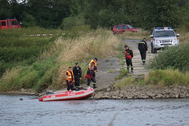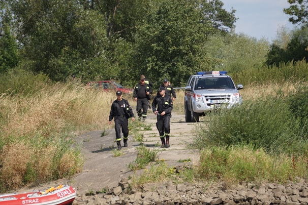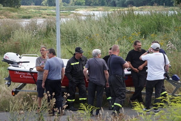 Na Odrze w Chobieni strażacy rozstawiają zapory, by substancję wyłapać. Prawdopodobnie jednak po drodze plama się rozmyła.