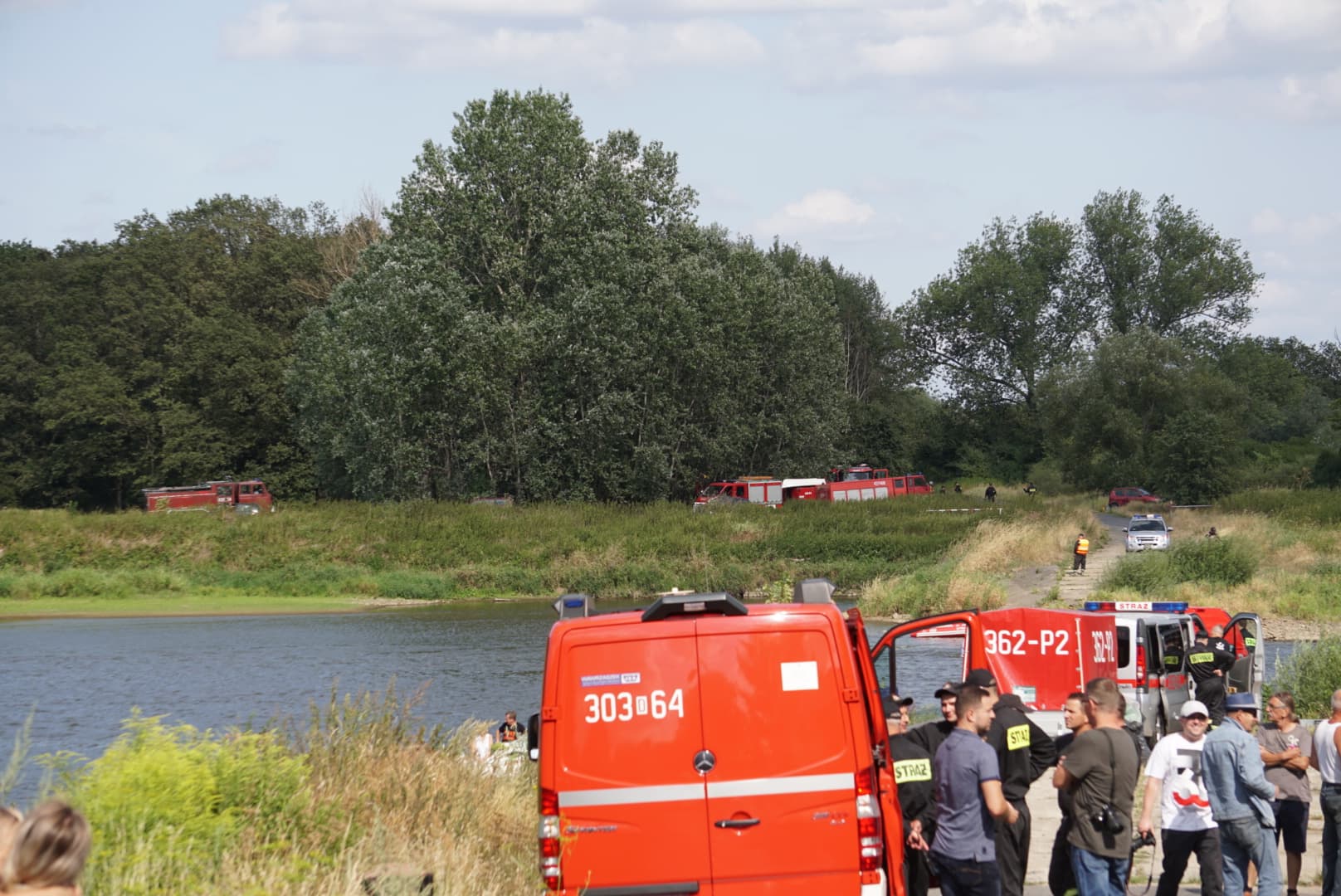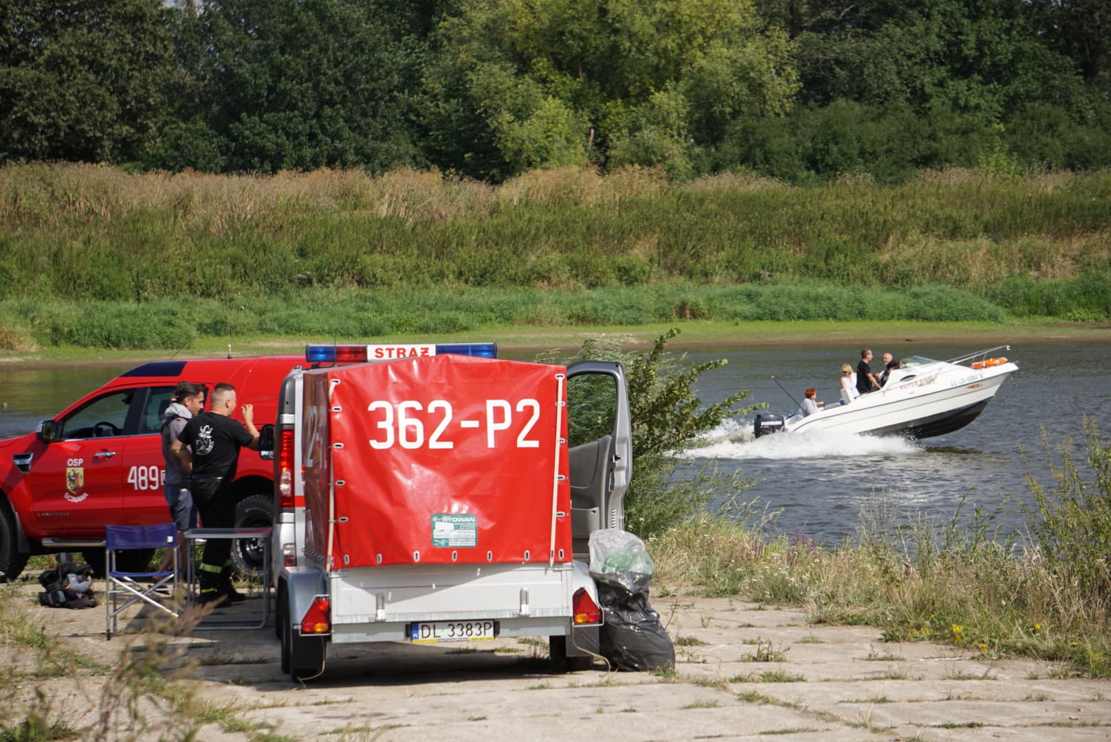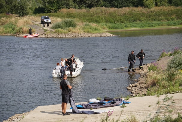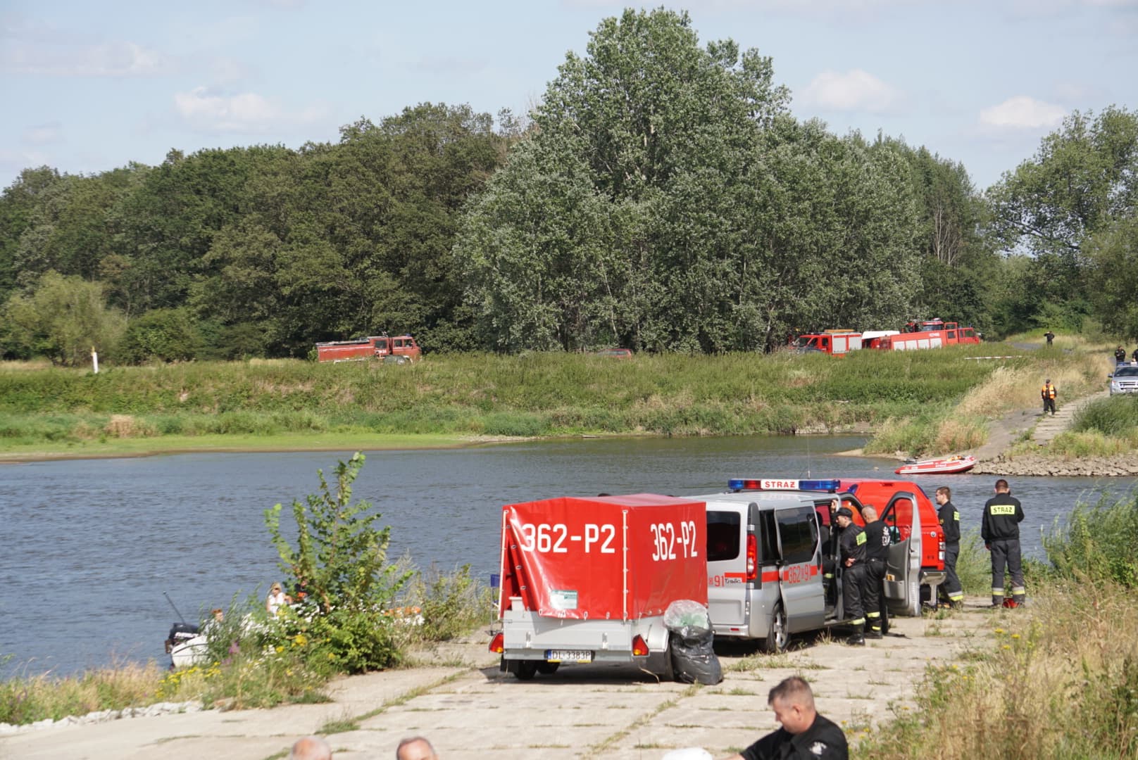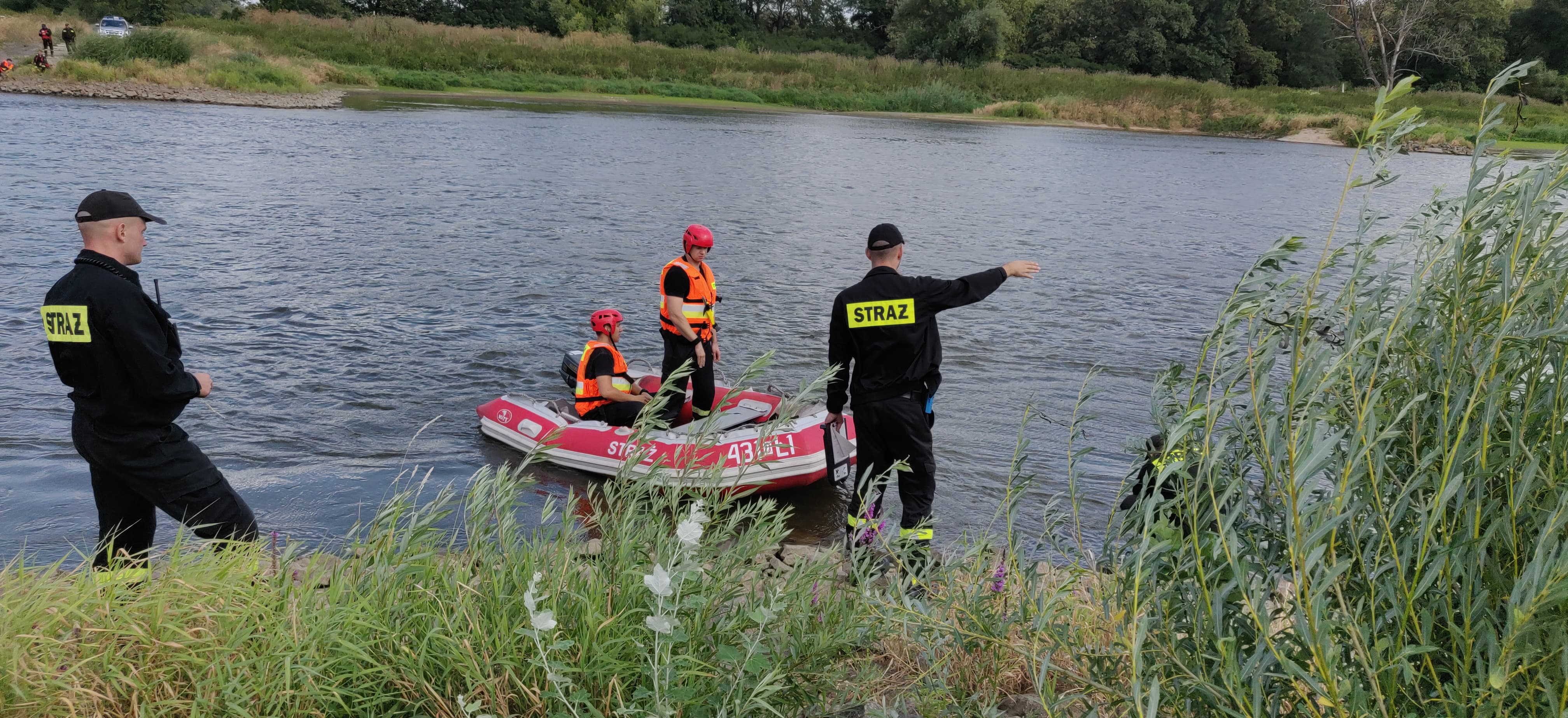 Na Odrze w Chobieni strażacy rozstawiają zapory, by substancję wyłapać. Prawdopodobnie jednak po drodze plama się rozmyła.