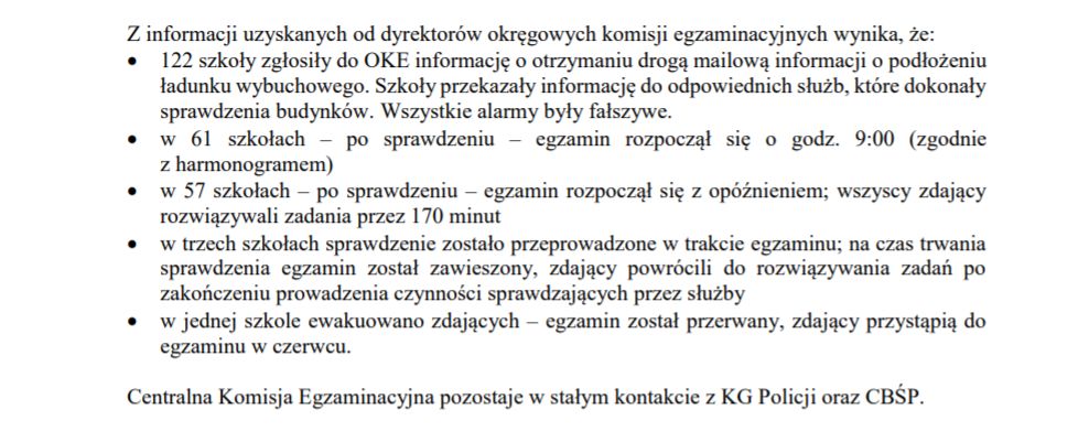 Niemiłą niespodzianką dla maturzystów były fałszywe alarmy bombowe, które dziś rano pojawiły się w 122 szkołach w całym kraju: