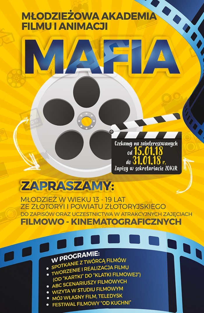 Ośrodek kultury w Złotoryi przygotował ciekawą propozycję dla młodych amatorów produkcji filmowych i kinematograficznych. Już od przyszłego poniedziałku rozpoczną się zapisy do Młodzieżowej Akademii Filmu i Animacji (MAFiA).