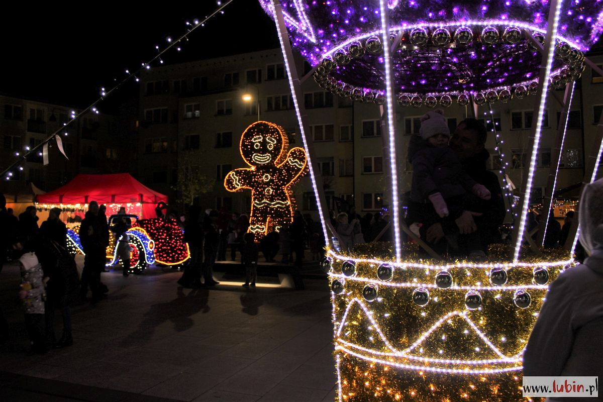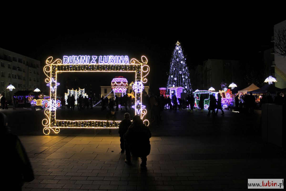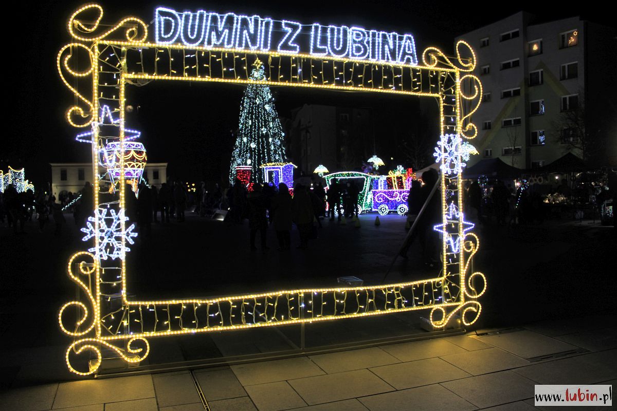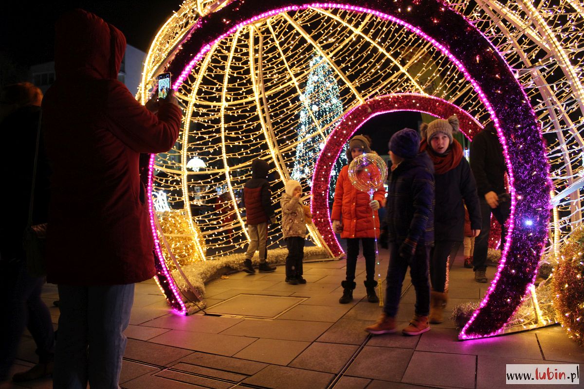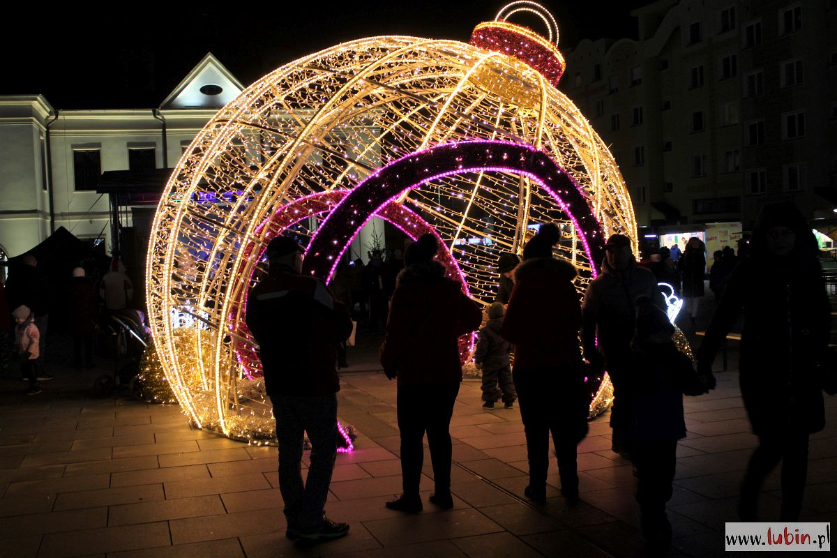 Lubiński rynek ozdobiły również przestrzenna bombka, ramka Dumni z Lubina, łuk i świetlne parawany. Przystrojono też uliczne lampy.