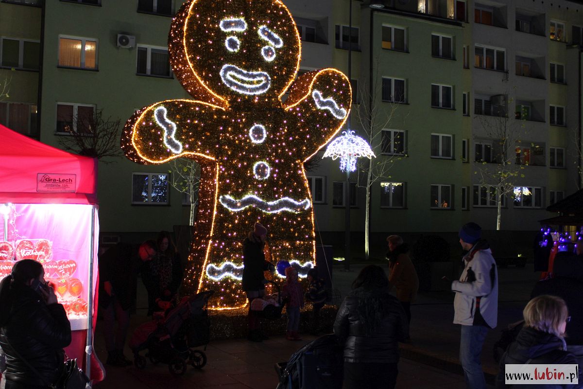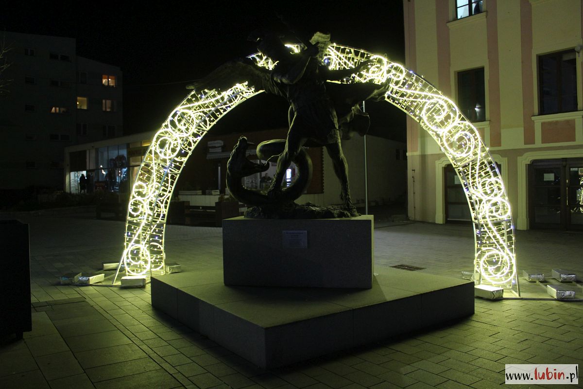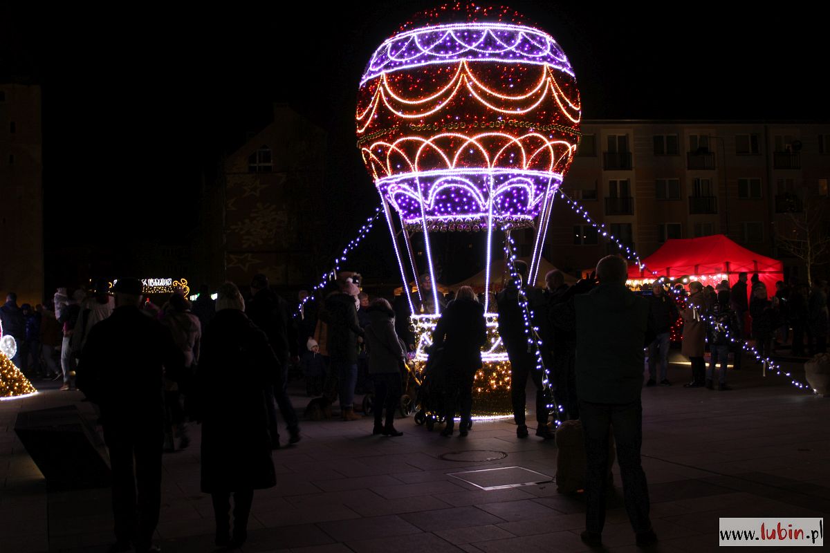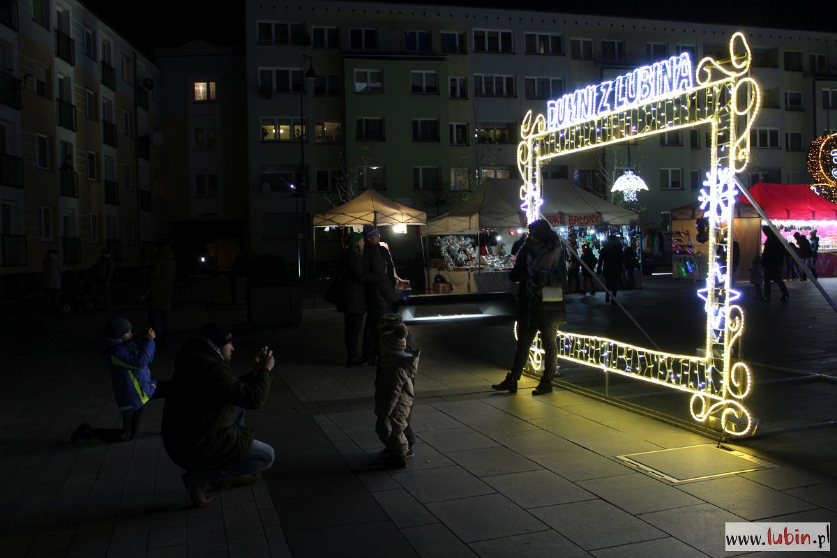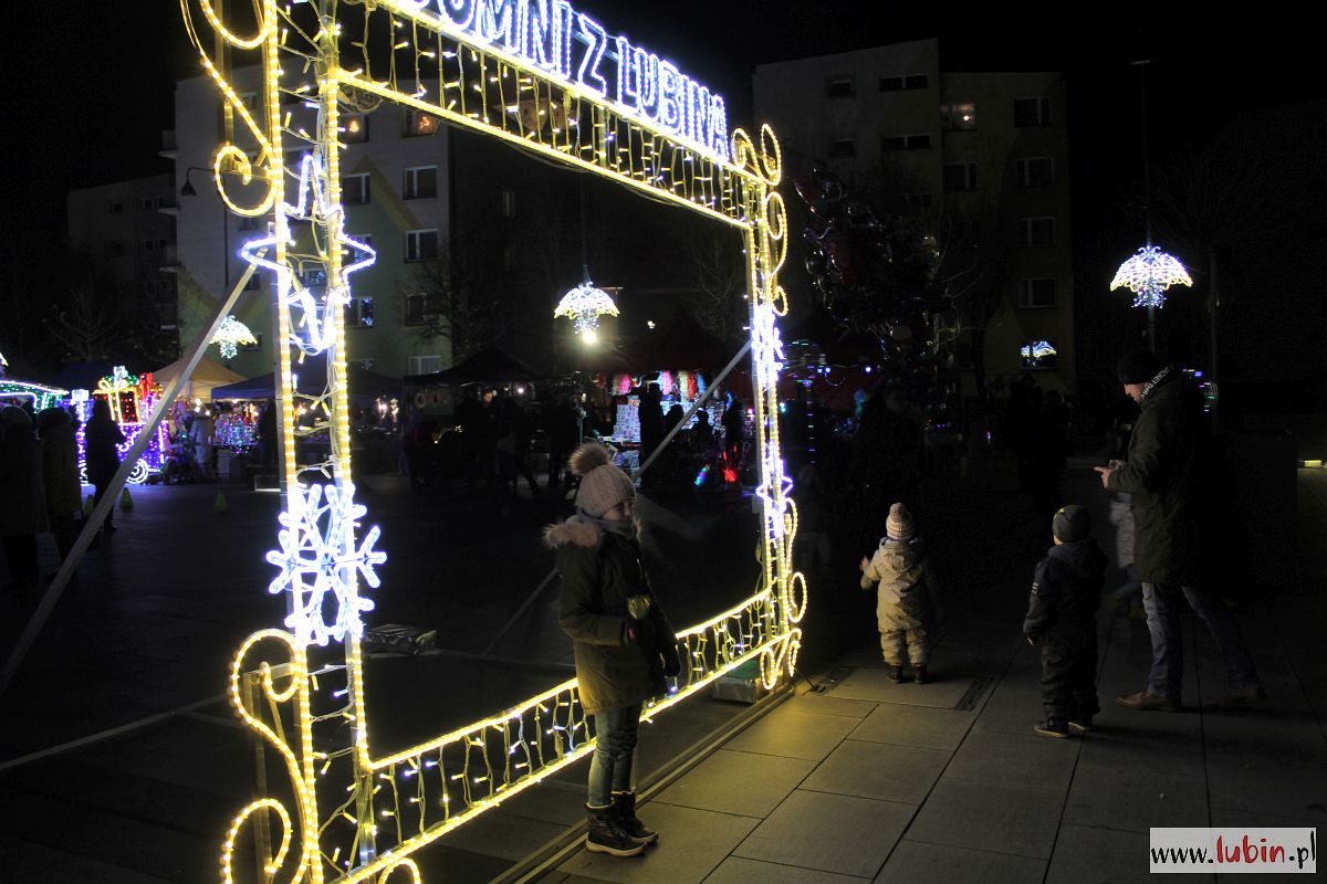Lubiński rynek ozdobiły również przestrzenna bombka, ramka Dumni z Lubina, łuk i świetlne parawany. Przystrojono też uliczne lampy.