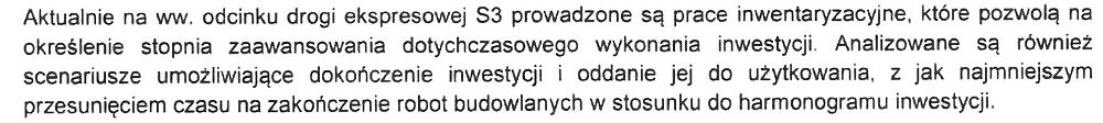 Po trzech tygodniach urzędnicy Ministerstwa Infrastruktury przygotowali odpowiedź. Podsumowali w niej ostatnie losy inwestycji, w tym rozwiązanie kontraktu z konsorcjum Salini-Pribex. Zapewnili też, że Generalna Dyrekcja Dróg Krajowych i Autostrad cały czas ponaglała wykonawcę. Jedyny akapit poświęcony przyszłości feralnego odcinka ekspresówki nie zawiera żadnych konkretów: