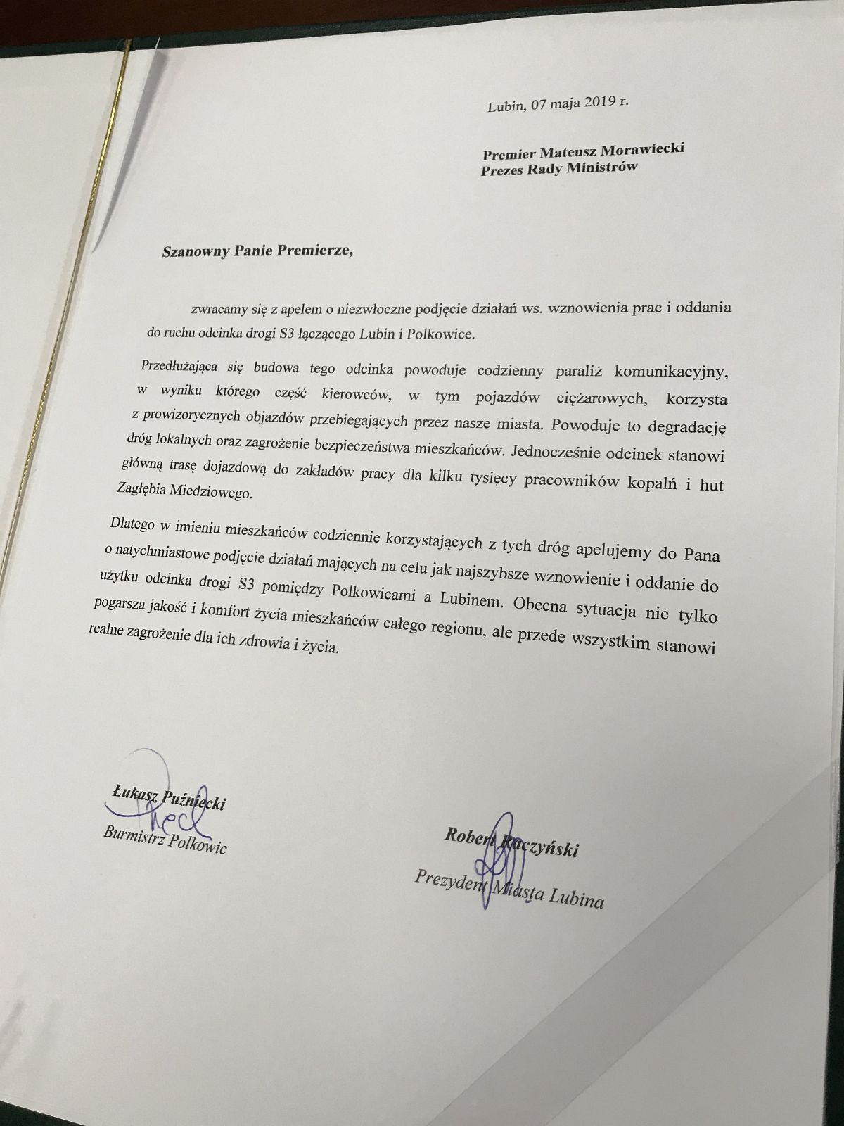 Niekończącą się budową 14-kilometrowego odcinka drogi ekspresowej S3 pomiędzy Lubinem a Polkowicami zbulwersowani są już nie tylko mieszkańcy Zagłębia Miedziowego, którzy pokonując ten niewielki dystans, często przez kilkadziesiąt minut muszą stać w korkach. W sprawie po raz kolejny postanowił zainterweniować prezydent Lubina Robert Raczyński wraz z burmistrzem Polkowic Łukaszem Puźnieckim. Zaapelowali do premiera Mateusza Morawieckiego o jak najszybsze wznowienie prac i oddanie drogi do użytku.