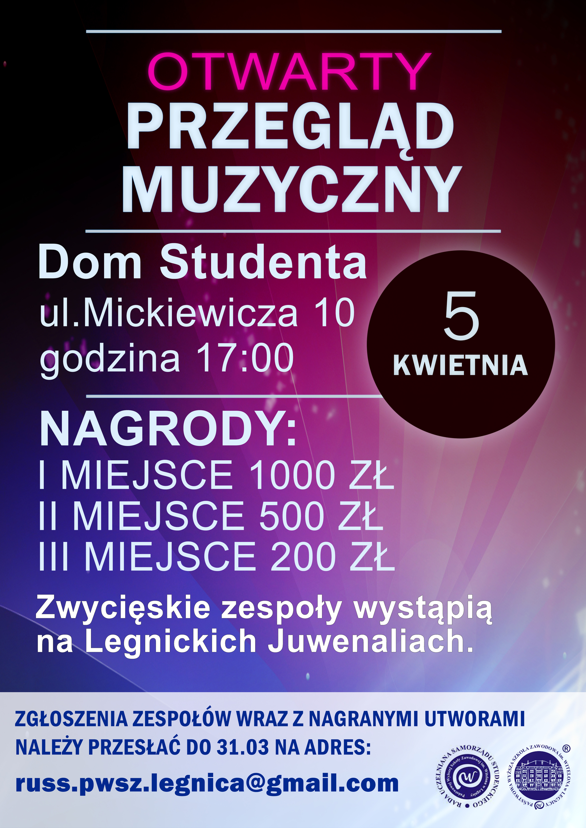 - 5 kwietnia – Rada Uczelniana Samorządu Studenckiego zaprasza na Otwarty Przegląd Muzyczny, który odbędzie się w Domu Studenta PWSZ im. Witelona w Legnicy o godzinie 17. Na wygranych czekają nagrody, a w tym: I miejsce 1000 zł; II miejsce 500 zł; III miejsce 200 zł. Ponadto zespoły, które wygrają będą miały możliwość zagrania na na Juwenaliach PWSZ im. Witelona w Legnicy w dniach 18-19 maja 2018 roku. Szczegółowe informacje na stronie https://www.facebook.com/events/1632703026819116/