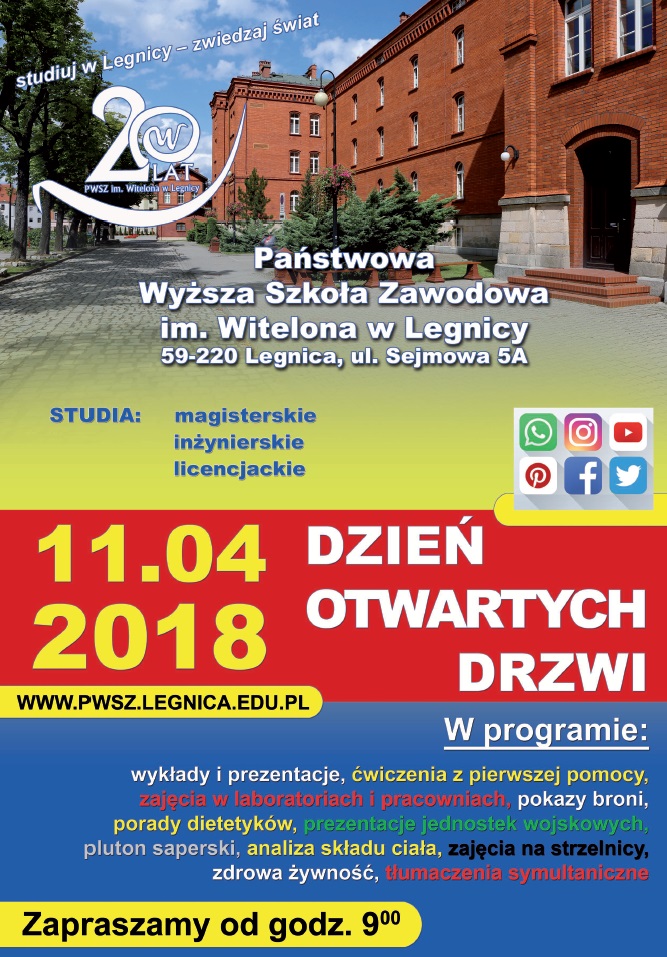 - 11 kwietnia – Dzień Otwartych Drzwi. Można będzie uzyskać wszelkie informacje o zasadach rekrutacji na studia w roku akademickim 2018/2019. Zaplanowano wiele atrakcji: wykłady i prezentacje, ćwiczenia z pierwszej pomocy, zajęcia w laboratoriach i pracowniach, pokazy broni, porady dietetyków, prezentacje jednostek wojskowych, pluton saperski, analizę składu ciała, zajęcia na strzelnicy, zdrową żywność, tłumaczenia symultaniczne, pokazy sprzętu wojskowego przygotowane przez Brygadę Kawalerii Pancernej im. gen broni Stanisława Maczka w Świętoszowie; 4. Głogowski Batalion Inżynieryjny oraz Wojskową Komendę Uzupełnień w Głogowie.