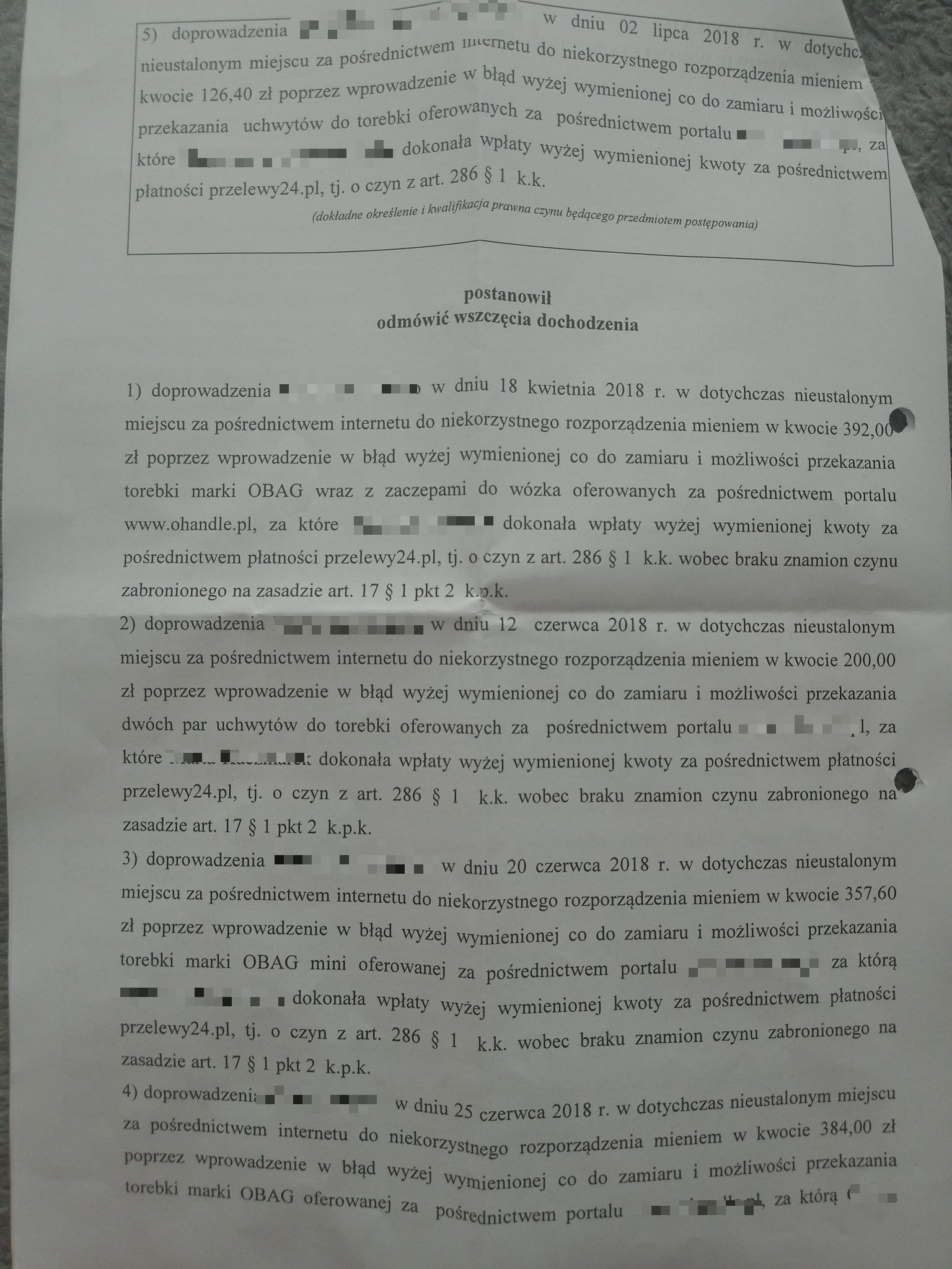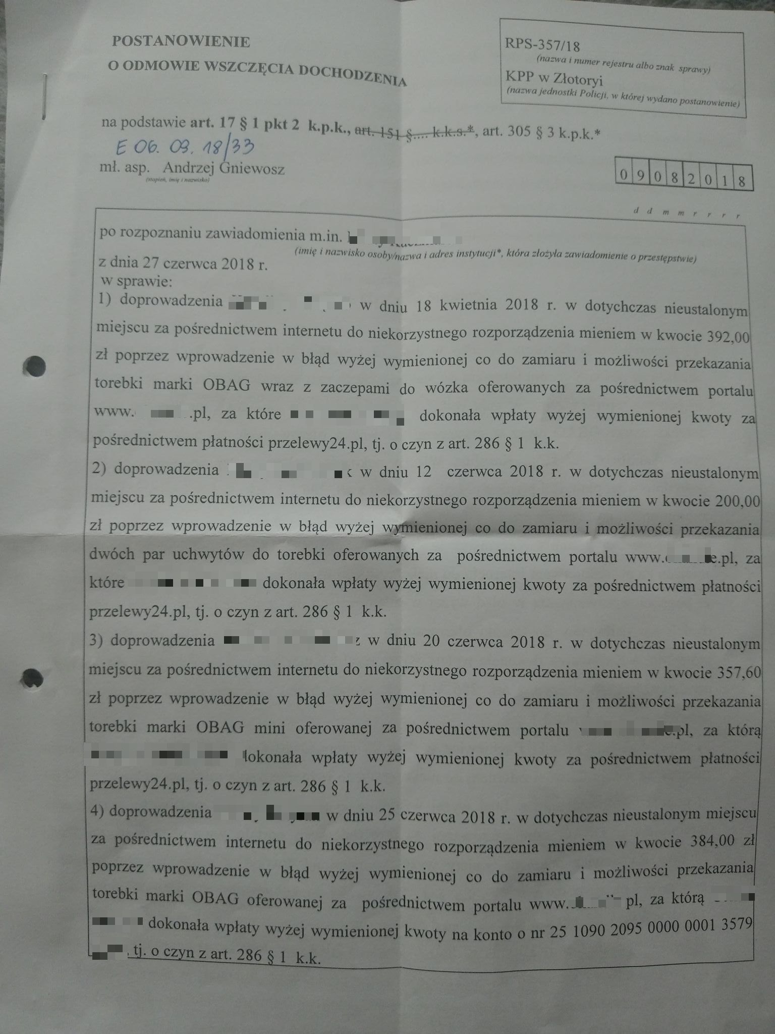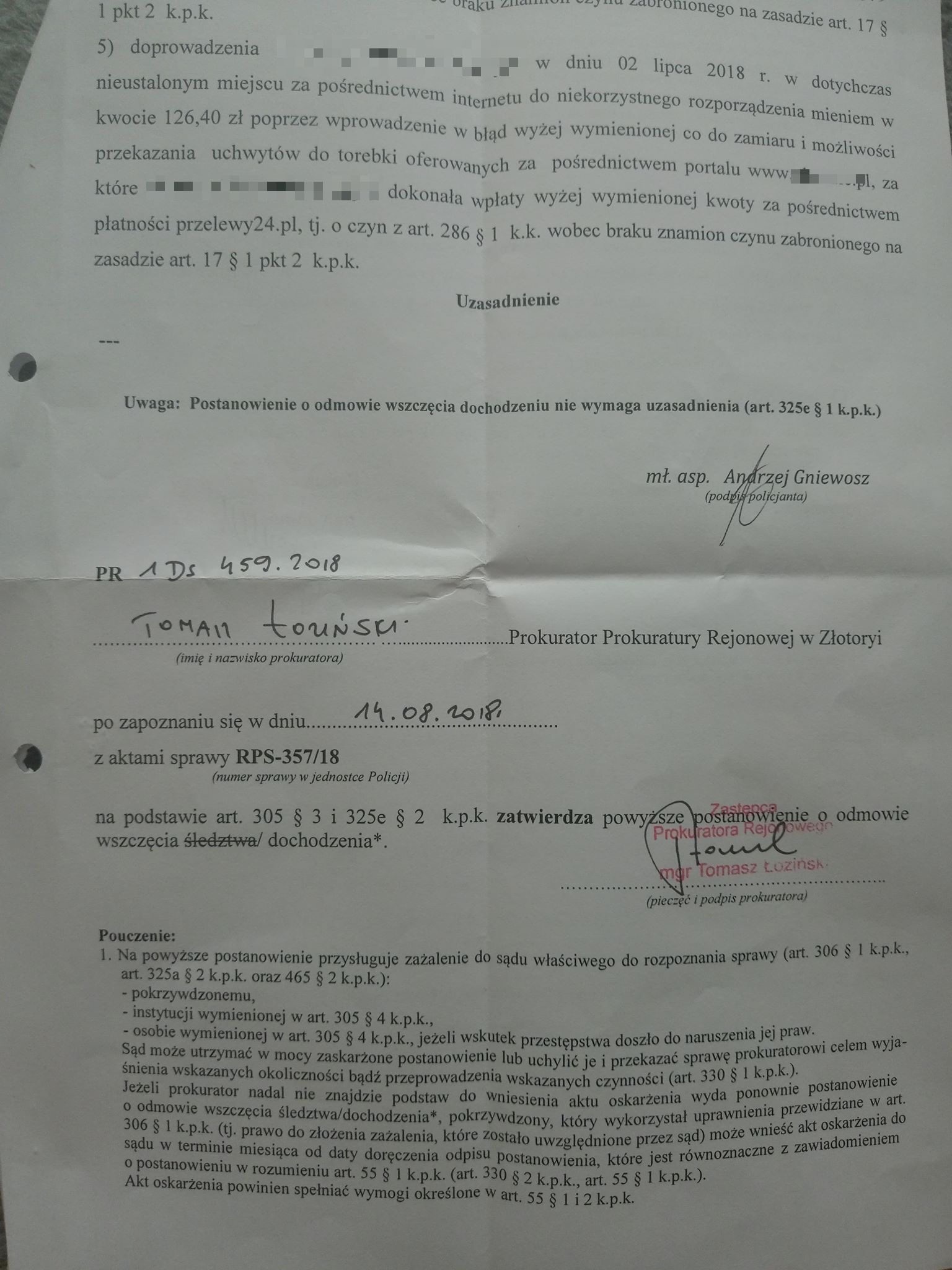 Jedna z poszkodowanych przesłała nam skan pisma (poniżej) z Komendy Powiatowej Policji w w Złotoryi informującego ją o odmowie wszczęcia dochodzenia w tej sprawie, zatwierdzonego przez prokuratora. Zamiast uzasadnienia pojawia się informacja, że: „Postanowienie o odmowie wszczęcia dochodzenia nie wymaga uzasadnienia (art. 325e par. 1 k.p.k.).