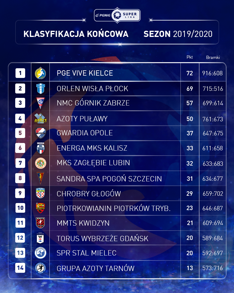 Ze względu na aktualną sytuację związaną z rozprzestrzeniającym się koronawirusem SARS-CoV-2 i wprowadzenie stanu epidemii w Polsce, Komisarz Ligi, w porozumieniu z zarządem Superligi Sp. z o.o., odpowiedzialnej za zarządzanie rozgrywkami PGNiG Superligi i PGNiG Superligi Kobiet, podjął decyzję o zakończeniu rozgrywek sezonu 2019/2020.