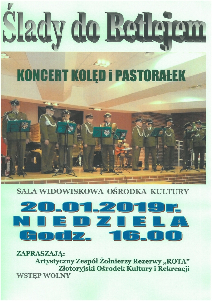 „Ślady do Betlejem” – pod taką nazwą odbędzie się jutro koncert kolęd i pastorałek w wykonaniu Artystycznego Zespołu Żołnierzy Rezerwy ROTA. Muzycy wystąpią w sali widowiskowej Złotoryjskiego Ośrodka Kultury i Rekreacji.