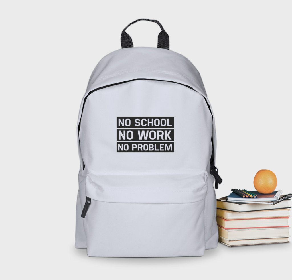 Pierwszą propozycją jest plecak z napisem „No school, no work, no problem”. Wymowna sentencja nawiązuje do szkolnych realiów, jednak nie jest zbyt kontrowersyjna. W swoim projekcie również możesz wykorzystać podobny tekst, modyfikując jego oprawę graficzną lub dodając detale.
