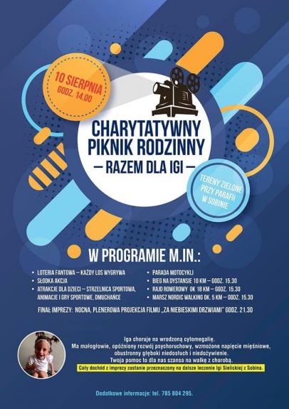 Wiele atrakcji, m.in. biegi, wyścigi rowerowe, parada motocykli i przelot śmigłowcem, czeka uczestników Charytatywnego Pikniku Rodzinnego „Razem dla Igi”. Impreza odbędzie się już w sobotę, 10 sierpnia, w Sobinie – na terenach zielonych przy plebanii.