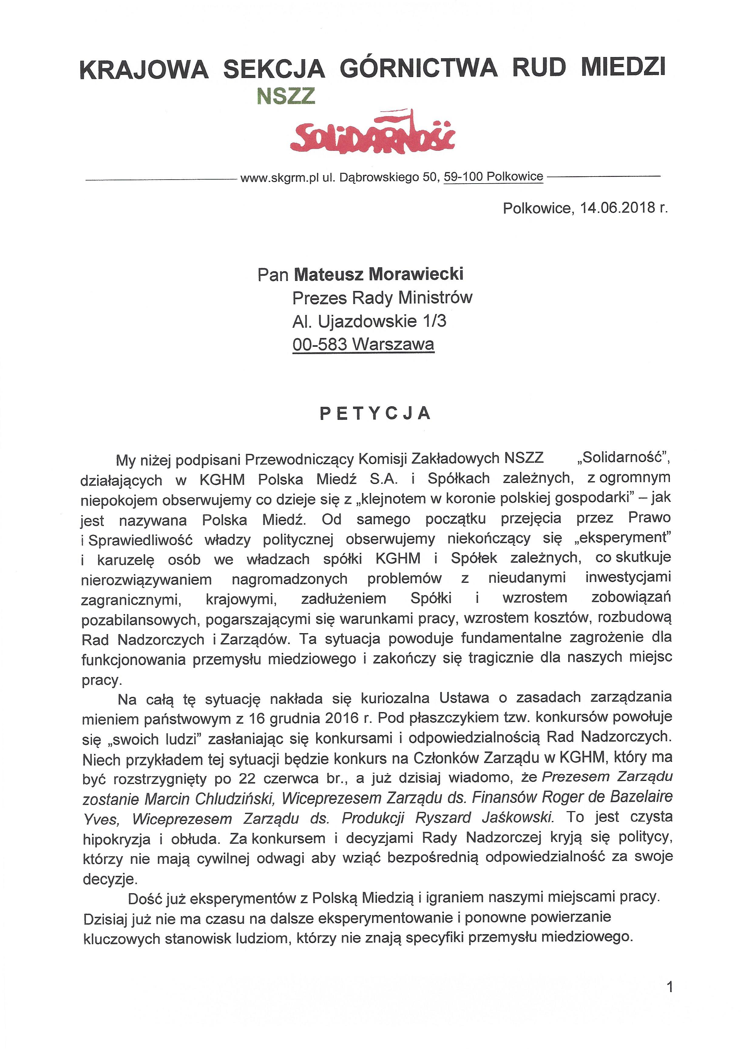 – Pod płaszczykiem tzw. konkursów powołuje się „swoich ludzi” zasłaniając się konkursami i odpowiedzialnością rad nadzorczych. Niech przykładem tej sytuacji będzie konkurs na członków zarządu w KGHM, który ma być rozstrzygnięty po 22 czerwca br., a już dzisiaj wiadomo, że prezesem zarządu zostanie Marcin Chludziński, wiceprezesem zarządu ds. finansów Roger de Bazelaire Yves, wiceprezesem zarządu ds. produkcji Ryszard Jaśkowski – piszą w petycji przedstawiciele Solidarności. – To jest czysta hipokryzja i obłuda. Za konkursem i decyzjami rady nadzorczej kryją się politycy, którzy nie mają cywilnej odwagi, aby wziąć bezpośrednią odpowiedzialność za swoje decyzje – czytamy daje w piśmie.